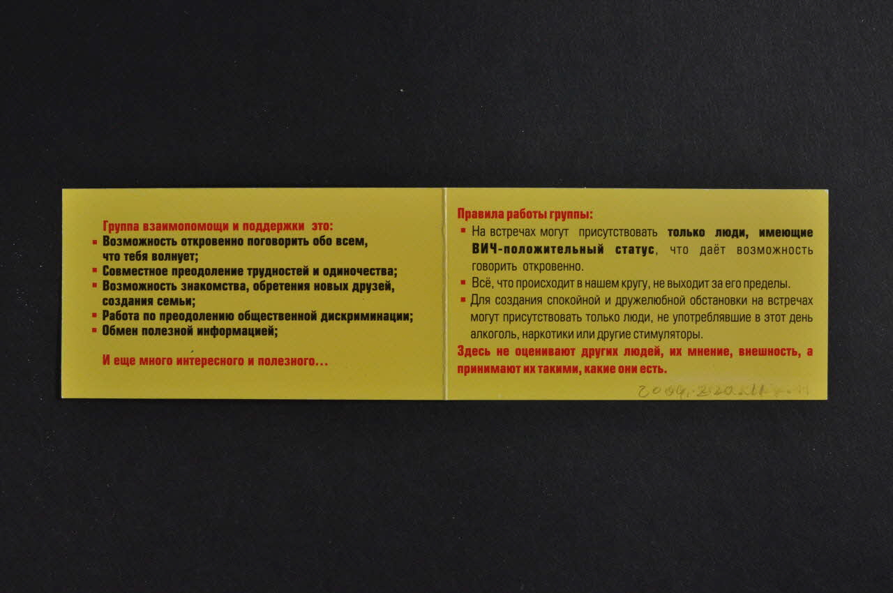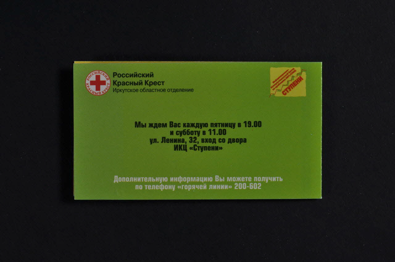 Petit dépliant, utilisé dans le sens horizontal, présentant une couverture de couleur verte. Au centre de la couverture, dans un cadre jaune, figure le dessin d'une photographie de famille : quatorze personnages (hommes, femmes, enfants, chats) vêtus de couleurs vives. A l'intérieur, sur un fond jaune, est imprimé un texte en caractères cyrilliques noirs et rouges.Au revers, sur un fond vert, figurent le logo de la Croix Rouge et ses coordonnées.Décor