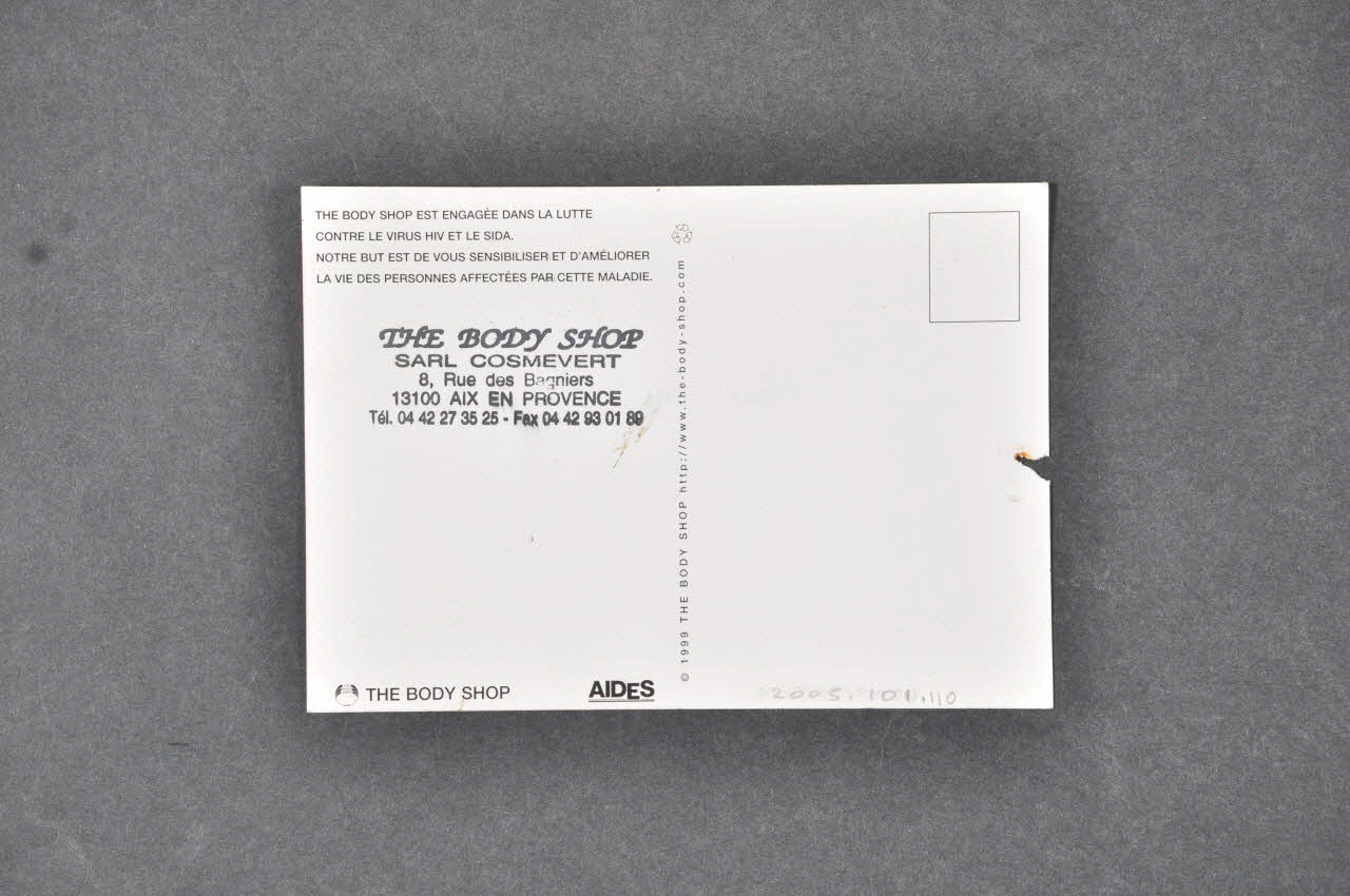 THE BODY SHOP EST ENGAGÉE DANS LA LUTTE // CONTRE LE VIRUS HIV ET LE SIDA. // NOTRE BUT EST DE VOUS SENSIBILISER ET D'AMÉLIORER // LA VIE DES PERSONNES AFFECTÉES PAR CETTE MALADIE. (Dans la partie supérieure gauche, en petites capitales noires), versoAdresse