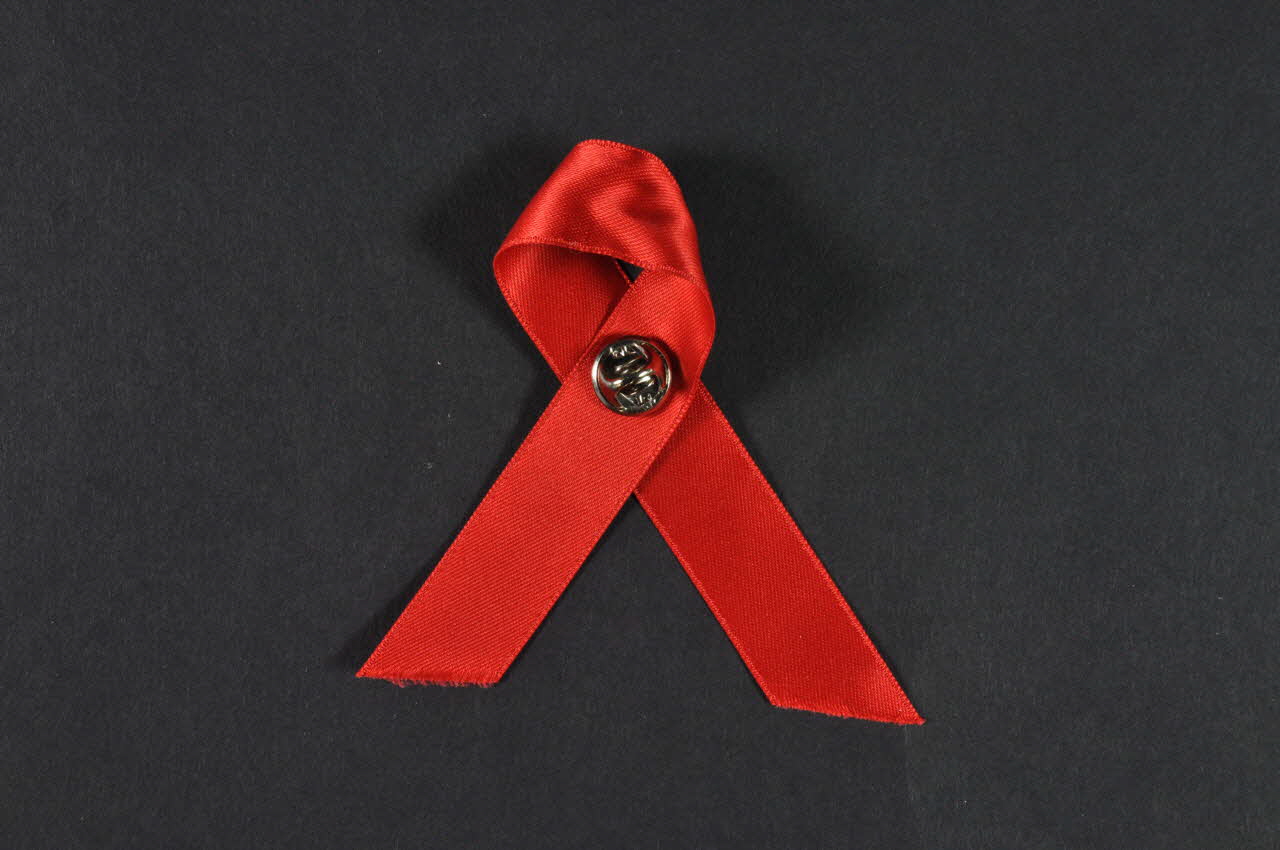 Grand ruban rouge en tissu, replié pour former le symbole de la lutte contre le SIDA, tenu au centre par un pin's (.2) qui a la forme du logo de l'association (demi cercle métallique ayant la forme d'une arche). .Il se referme avec une attache au dos (.3).Décor