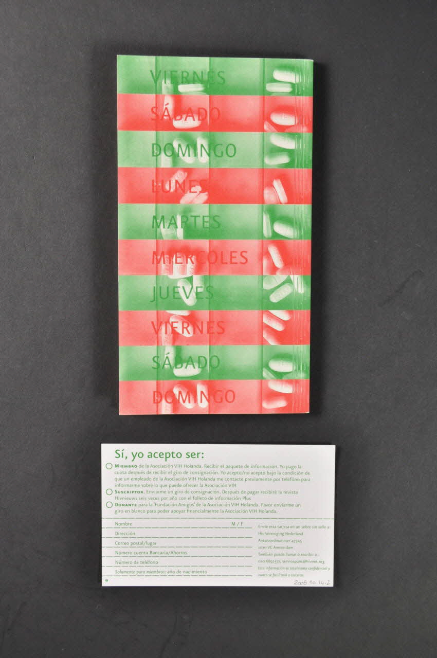 Hiv Vereniging Nederland (Sur la carte on peut voir une grande inscription en caractères gras et rouges.), rectoEscogiendo // la Terapia // Combinada ? (Le titre est marqué en caractère blanc dans la partie supérieure de la première de couverture.), sur la couvertureSi, yo acepto ser: (Sur la carte on peut voir une grande inscription en caractères verts.), versoAdresse