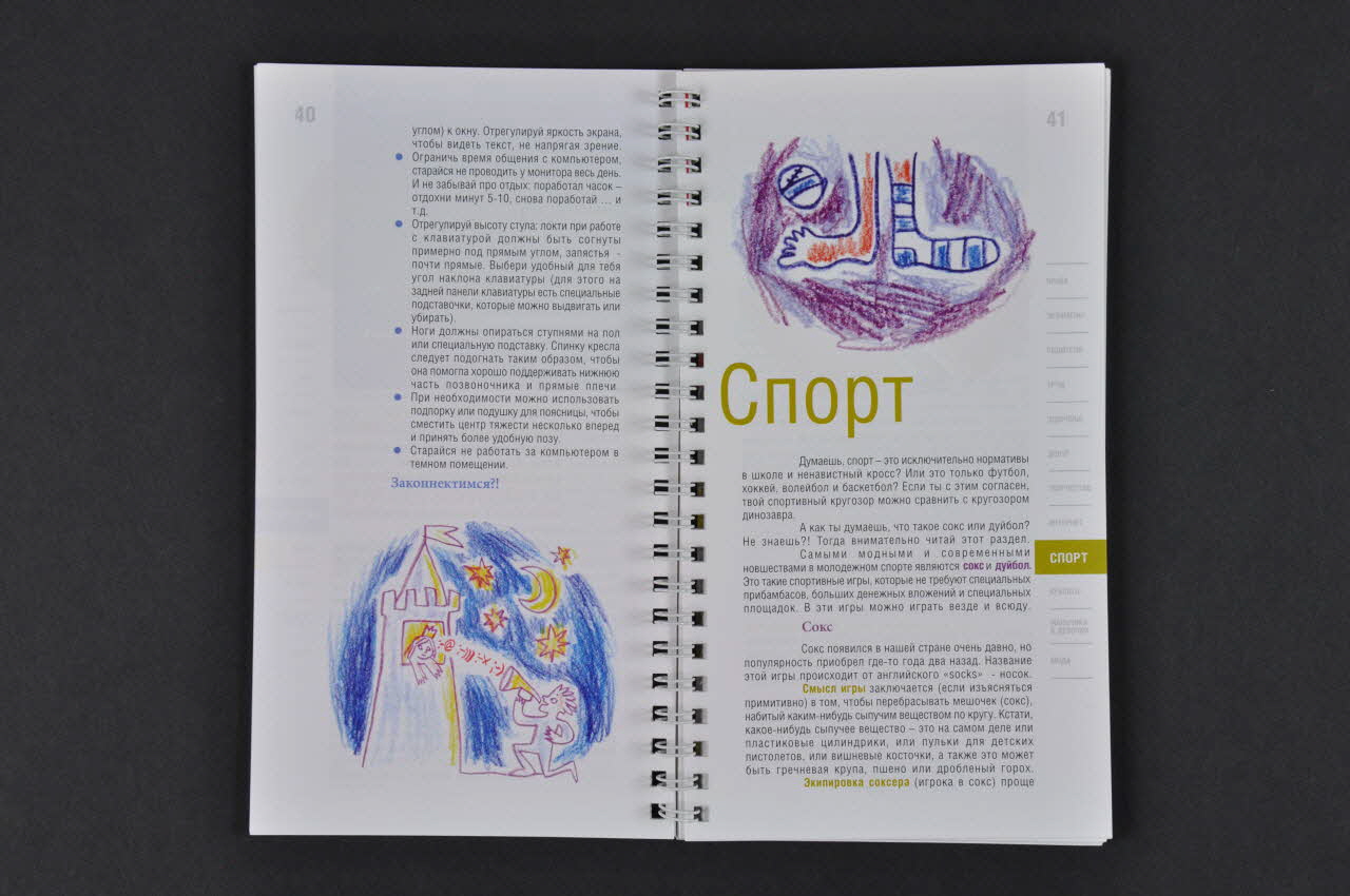 La couverture est en papier glacé cartonné, elle a un fond orange, dessus on peut voir un dessin d'enfant représentant un personnage roux en train de lire. En haut il y a le titre en alphabet cyrillique et sur le côté sur un fond blanc il y a six dessins correspondant aux chapitres. Au dos on trouve un texte en noir sur fond orange et les logo et adresses de l'association. A l'intérieur la revue est divisée en deux parties presque égales, une première partie sur la prévention du sida et un carnet de note en papier quadrillé de rouge. La première partie est en papier glacé, le sommaire est en page 1 ensuite on trouve des chapitres qui ont chacun un code couleur différent (ce code est indiqué sur le sommaire). Les titres de chaque chapitre suivent ce code couleur et les sous-titres aussi, le texte est en noir. Chaque chapitre est illustré de dessins d'enfants. Il y a 60 pages de texte.Décor