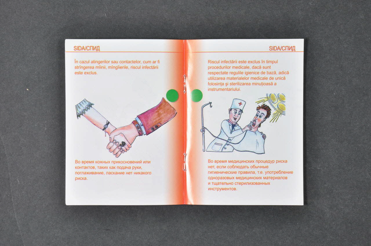 Programului National de Profilaxie si Combatere HIV/Sida si IST soutenu par le Fonds Mondial. Intérieur. En haut, en moldave ; au centre, grand dessin illustratif style BD, souvent humoristique ; en bas, en russe. Grand "!" rouge pour les pratiques à risque, point vert pour les pratiques sans risque. - Objectifs de la borchure : combattre les idées fausses sur la transmission - Règle d'or : La fidélité - Ne pas partager les seringues - Transmission mère enfant - Pénétration anale sans protection (entre hommes ou entre homme et femme) - Pénétration vaginale - Fellation - Sans risque : baiser - Sans risque : poignée de main - Sans risque : dentiste si hygiène de base - Sans risque : piqure de moustique - Sans risque : Héberger un porteur du virus - Sans risque : Piscine - Sans risque : Toux - Sans risque : Repas - Sans risque : Vie quotidienne - Sans risque : Coiffeur, manucure, tatouage si hygiène de base A la fin, conseils récapitulatifs - Savoir utiliser les préservatifs - Eviter les relations sexuelles non protégées - Ne pas avoir de relations sexuelles sous l'influence de drogues ou d'alcool - Réduire le nombre de partenaires sexuels - Eviter les seringues déjà utilisées ou les stériliser