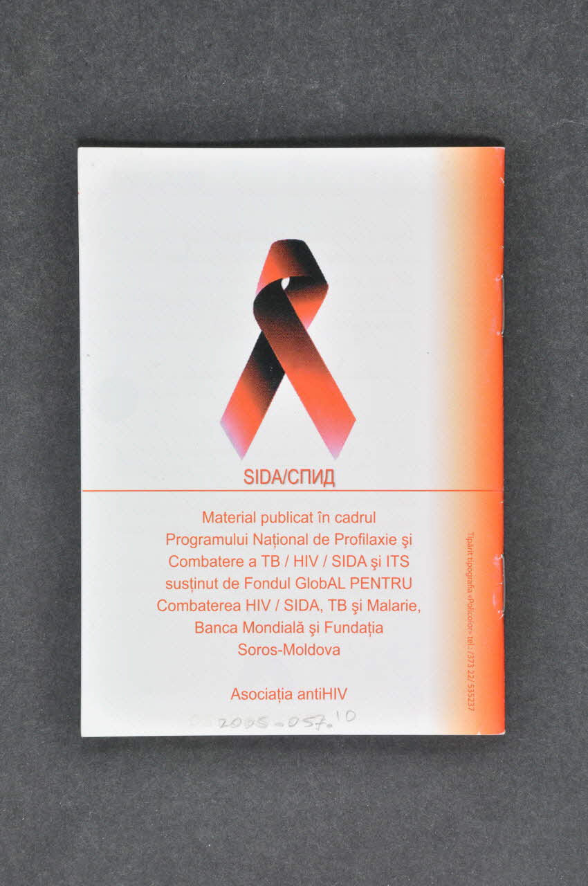 Une bande rouge verticale occupe le côté gauche. Sur l'arrière de la couverture, on découvre le symbole du sida dans la partie haute et des inscriptions rouges dans la partie basse. L'intérieur comporte un texte en russe et en moldave, en lettres rouges, ainsi que plusieurs dessins de couleurs sur le thème de la transmission du sida.Décor