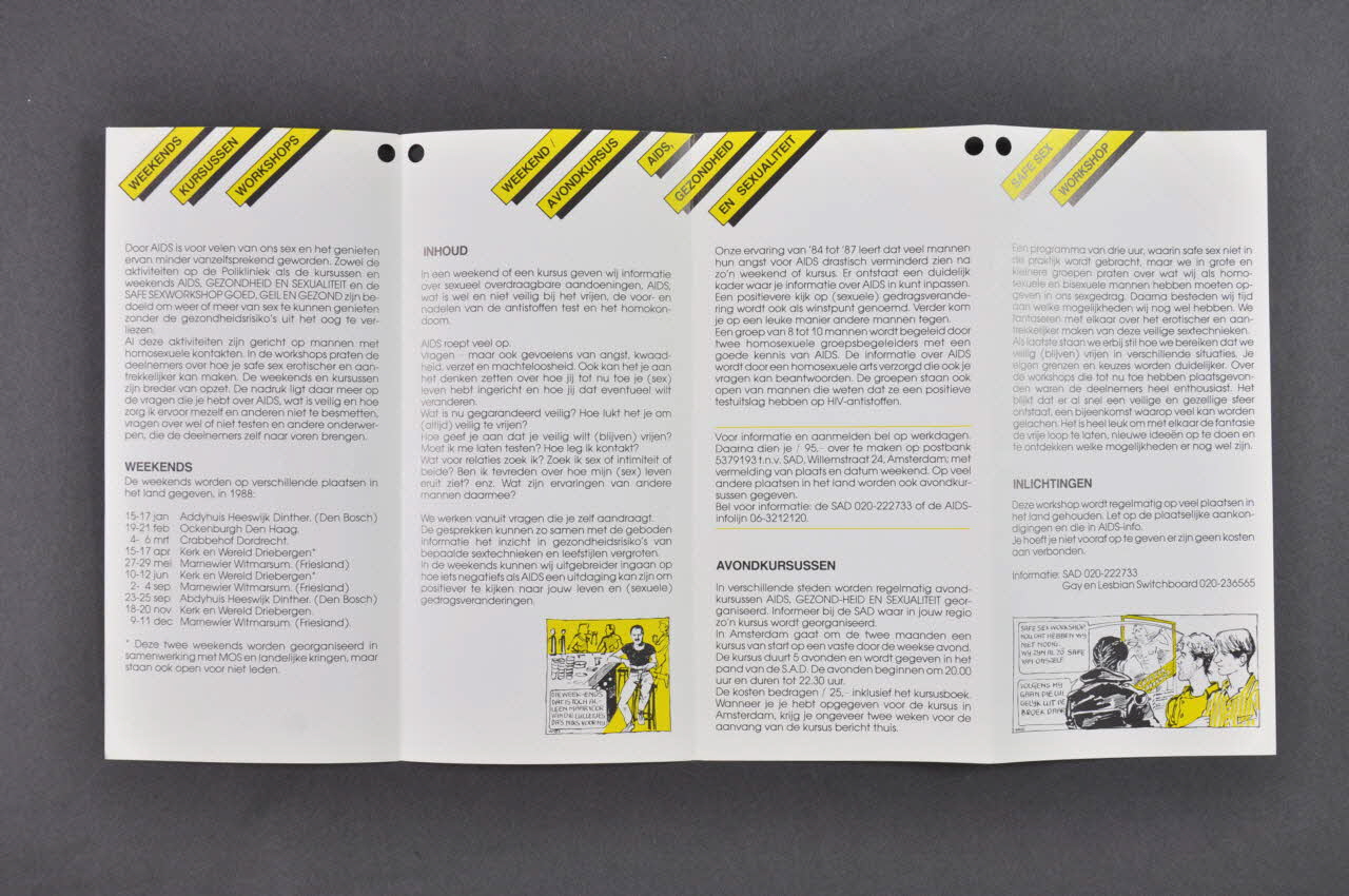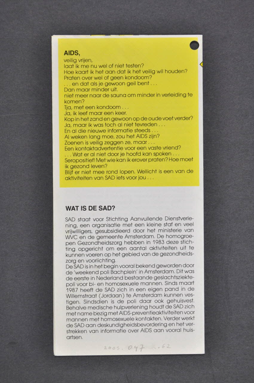 Dépliant : "Stichting Aanvuellende Dienstverlening (SAD)" // Weekends / Workshops / Polikliniek / Sero + groepen / Avondkursussen. (sur la couverture)Weekends / Kursussen / Workshops / Weekend / Avondkursus / AIDS / Gezondheid / En Sexualiteit / Safe sex / Workshop / Polikliniek / Geslachtsziekte / En AIDS / Groepen / Seropositieven. (à l'intérieur)Titre
