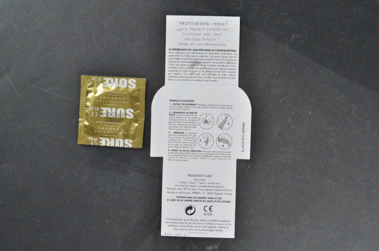 Préservatif en latex contenu dans une enveloppe carrée en plastique doré, sur laquelle sont imprimés des inscriptions blanches formant le logo.