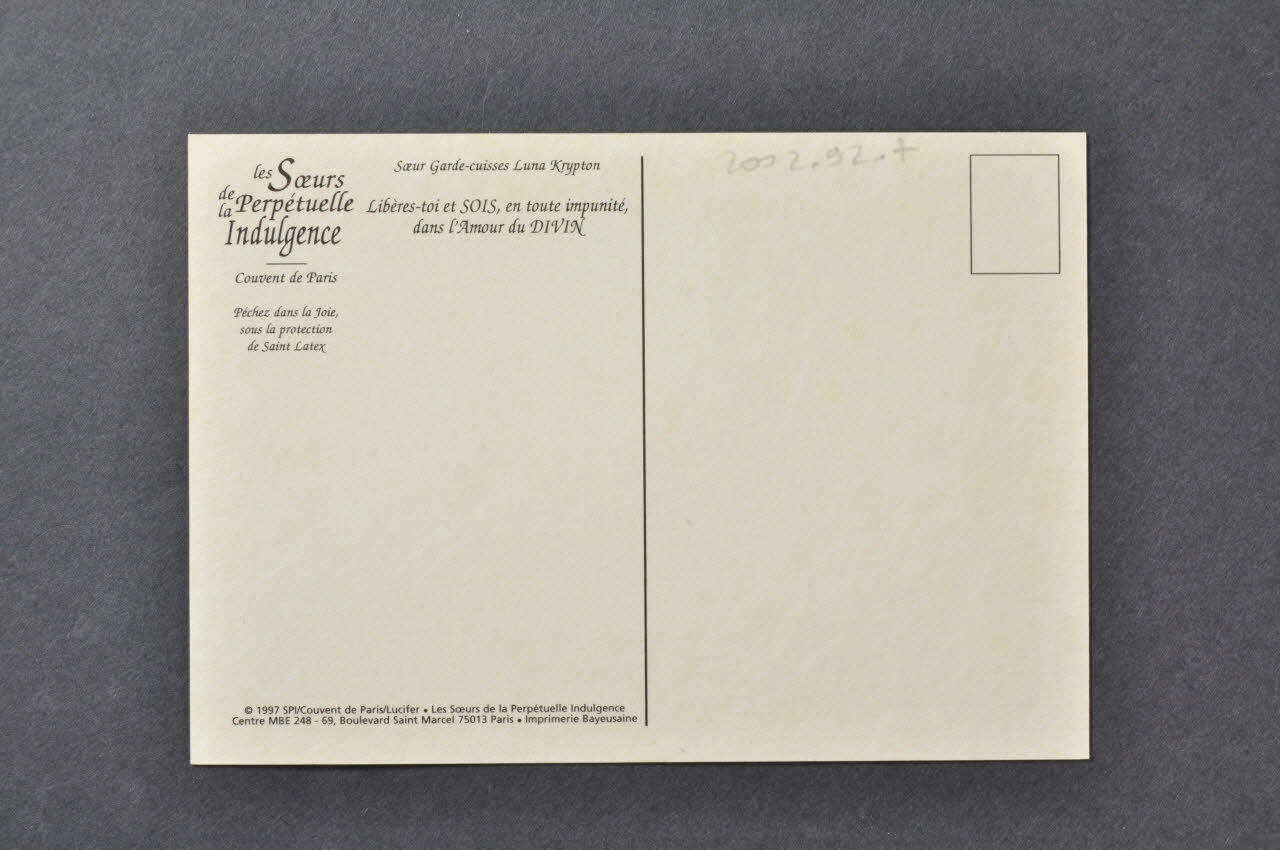 © 1997 SPI/ Couvent de Paris / Lucifer. "Les Soeurs de la Perpétuelle Indulgence. Centre MBE 248 - 69 Boulevard Saint Marcel 75013 Paris. Imprimerie Bayeusaine (en bas à gauche), versoSlogan