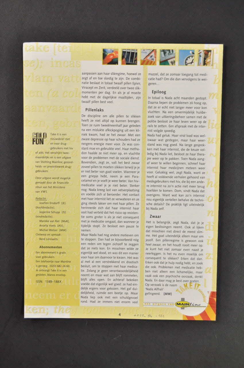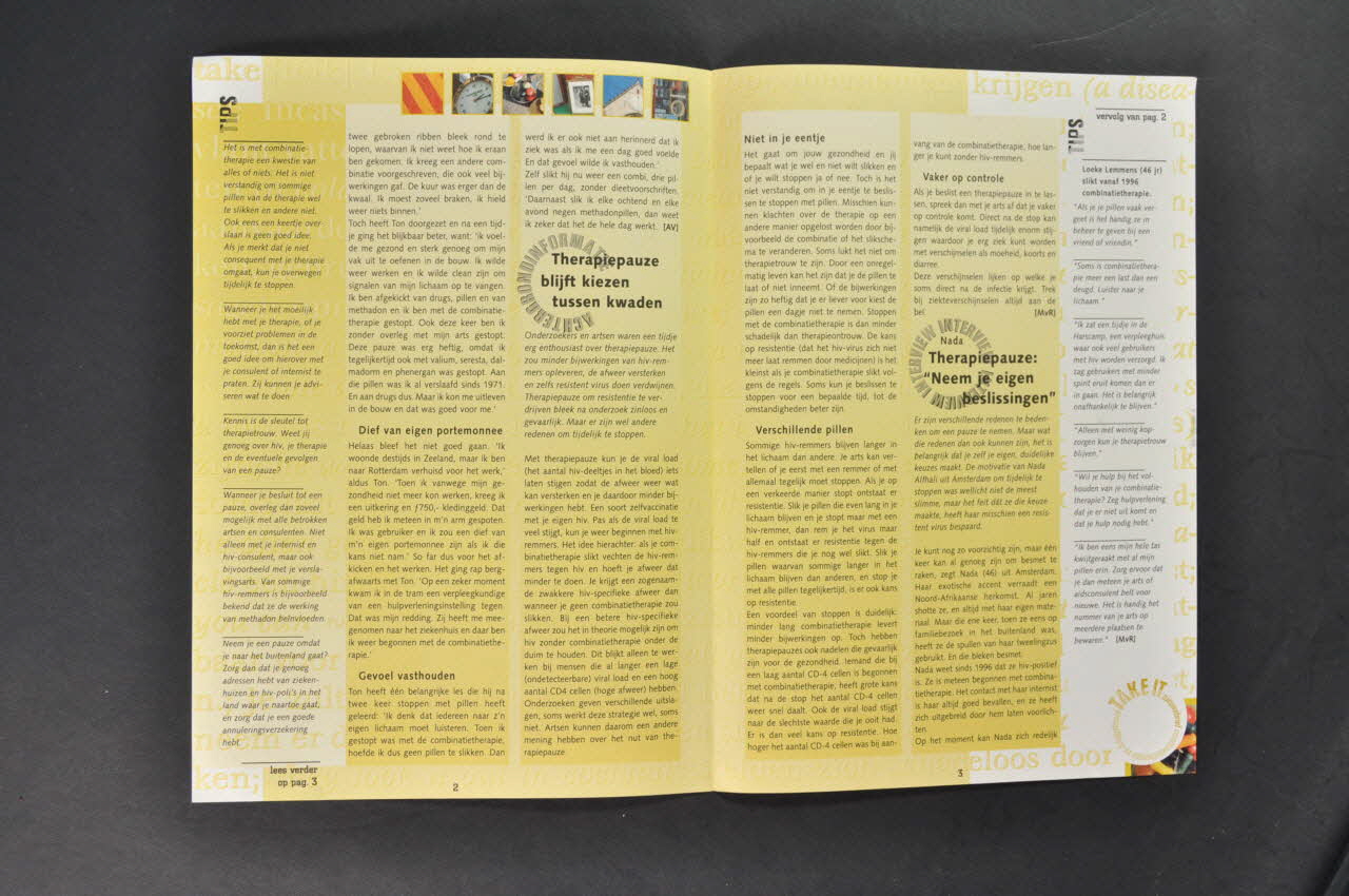 Sommaire en partie traduit : - p.1 Annonce du contenu du numéro : " Alles of niets. Zelf rommelen met combinatietherapie altijd een slecht idee" (traduction) - p.1-2 Interview Ton : "Een ongeorganiseerde vakantie (pause thérapeutique...) - p.1-2 Tips (Conseils sur la pause thérapeutique) - p.2-3 Achtergrondinformatie : "Therapiepauze blijft kiezen tussen kwaden - p.3-4 Interview : Nada. Therapiepauze : "Neem je eigen beslissingen"