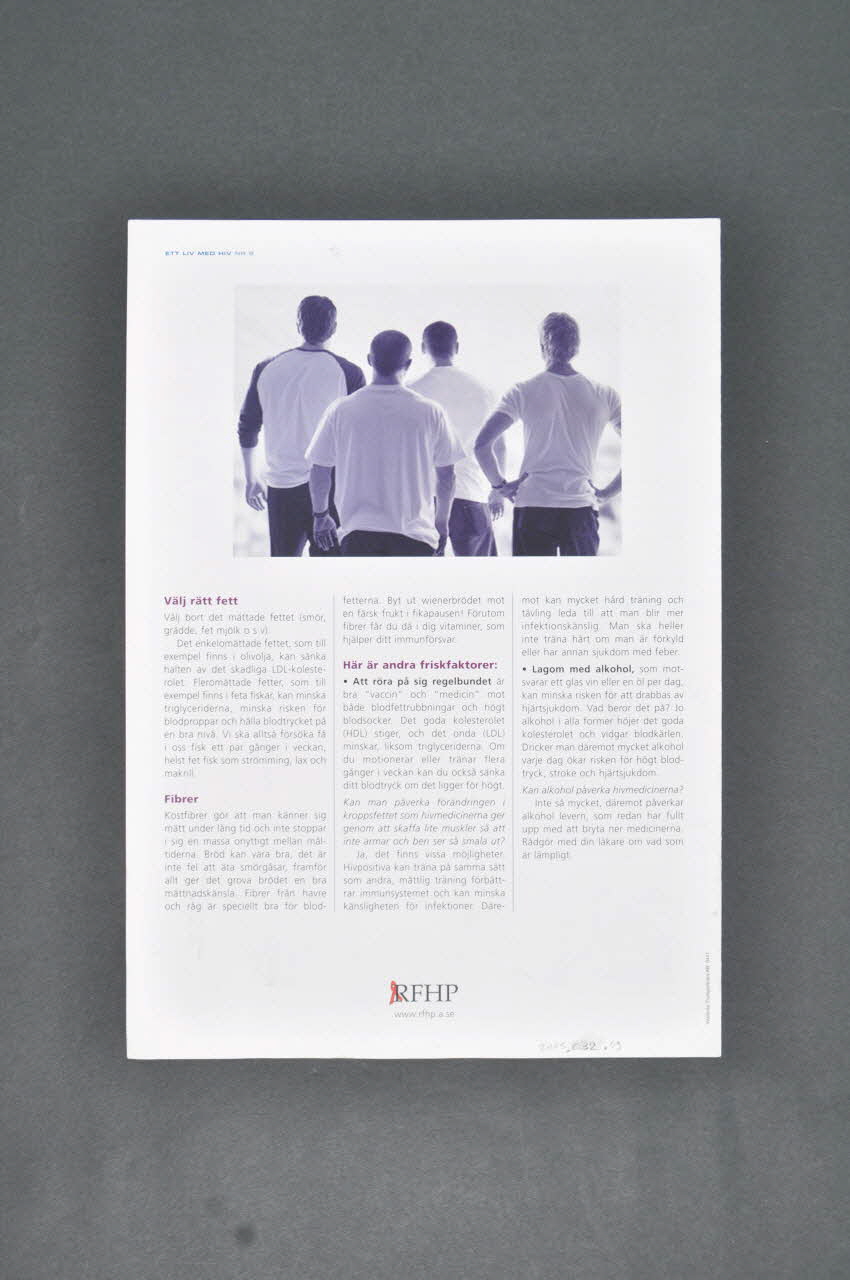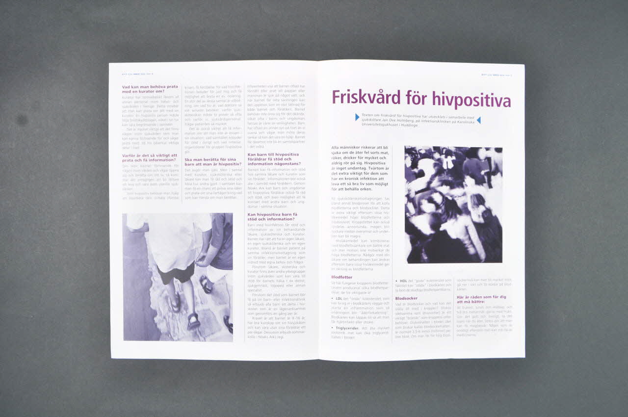 Ett liv med hiv är namnet på en // informationsskrift som ges ut av // Riksförbundet för hivpositiva // (RFHP). Ett liv med hiv ingår i ett // stort informationsprojkt som syftar // till att öka kunskapen om hur det // är att leva med en hivinfektion. // Läs mer om sjukdom, behandling // och hur du bäst kan skydda dig // mot hiv på www.rfhp.a.se // Här kan du också få svar på dina // egna frågor om hiv och aids. // // Riksförbundet för hivpositiva // [...] www.rfhp.a.se // eller ring vårt kansli i Stockholm på // telefon 08-714 54 10 // // Ett liv med hiv är framtaget med stöd av Roche AB (page 1, dans un encart bleu), à droiteDécor