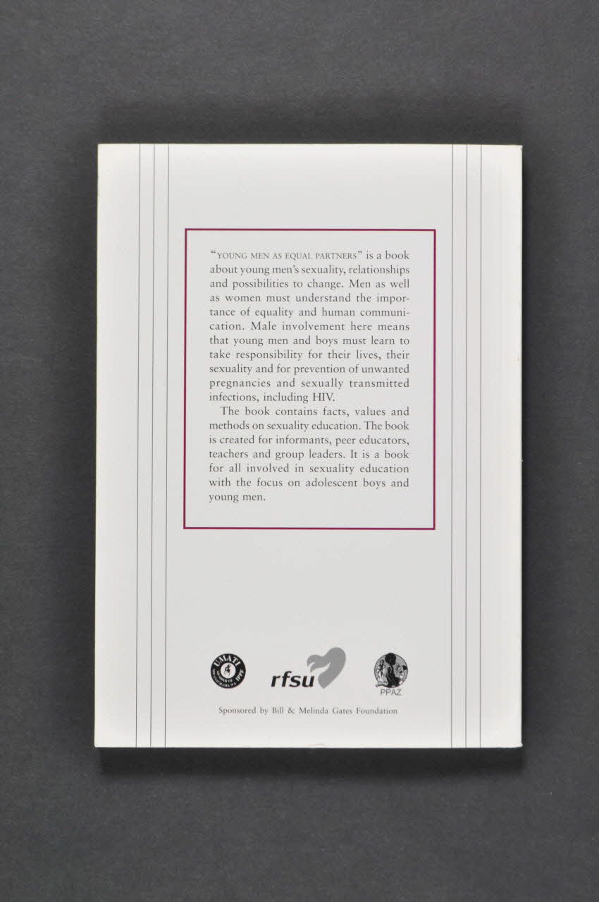 Livre de 119 pages à couverture souple blanche avec grand bandeau violet et motif de spirale grise dans l'angle supérieur droit. Au milieu en lettres blanches "Young men as Equal Partners (Les jeunes hommes comme partenaires égaux). Ce livre a été créé à l'intérieur du projet YMEP. Une collaboration entre les associations de planning familial de Tamzanie, Zambie et Suède par Erik Centerwall et Stefan Laack."