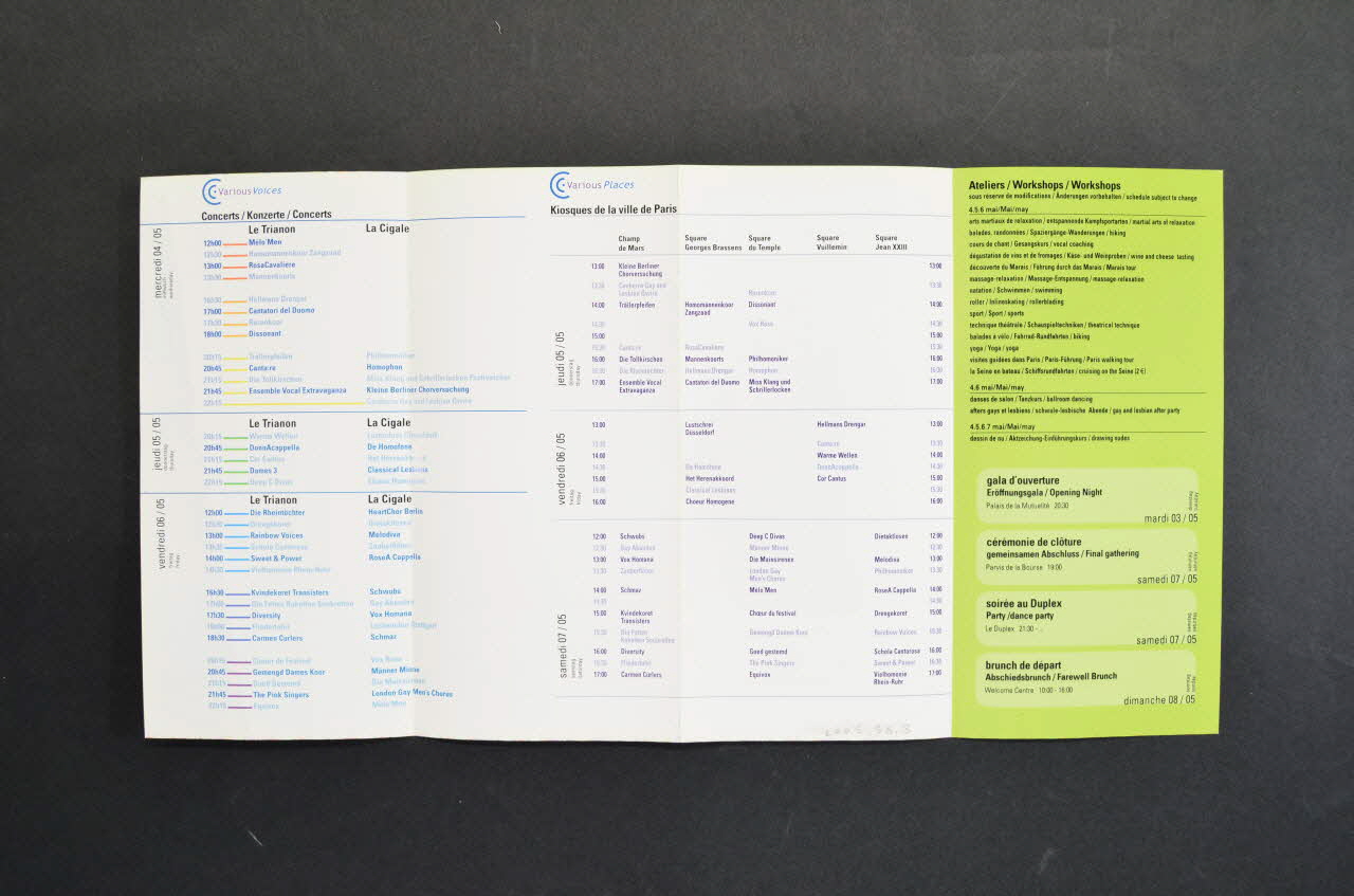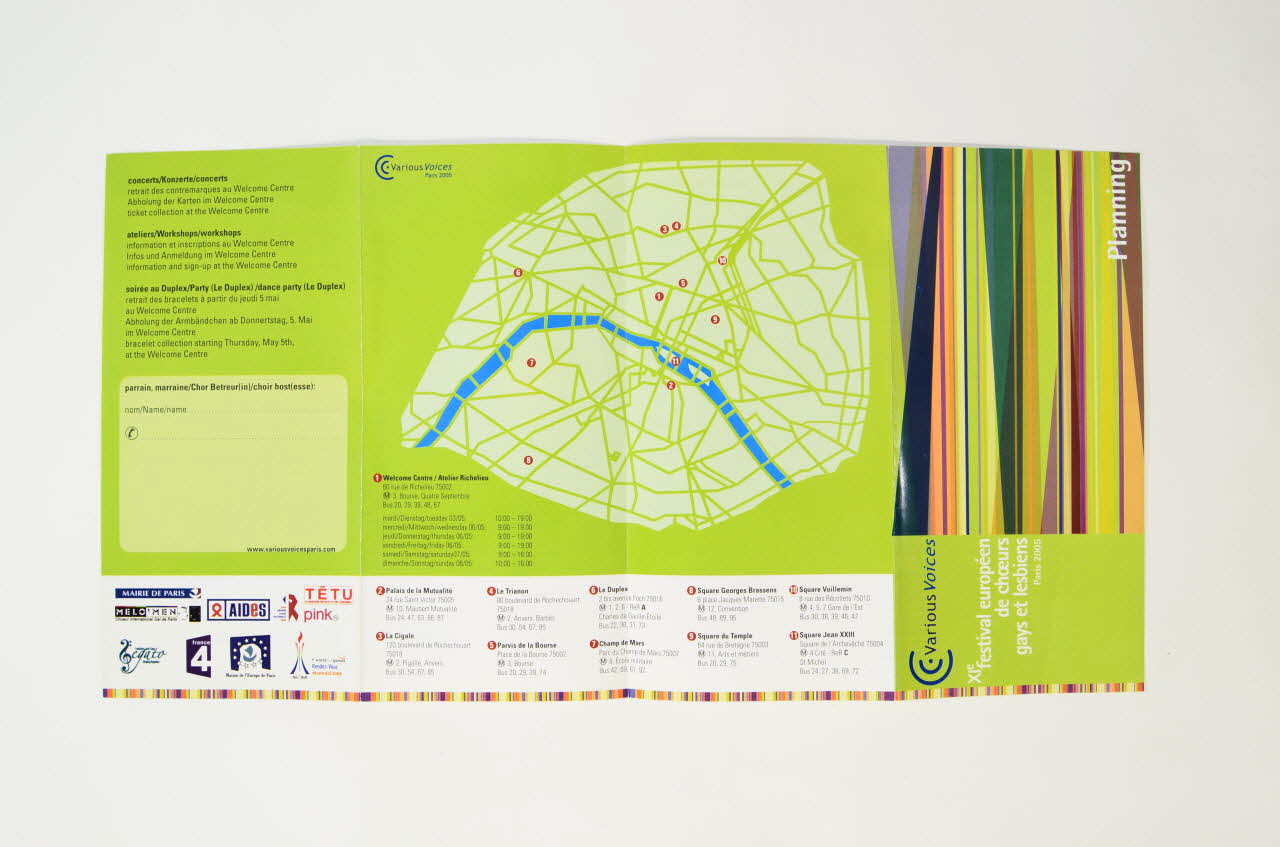 Dépliant, "Planning . XI° festival européen de choeurs gays et lesbiens. Paris, 2005. "