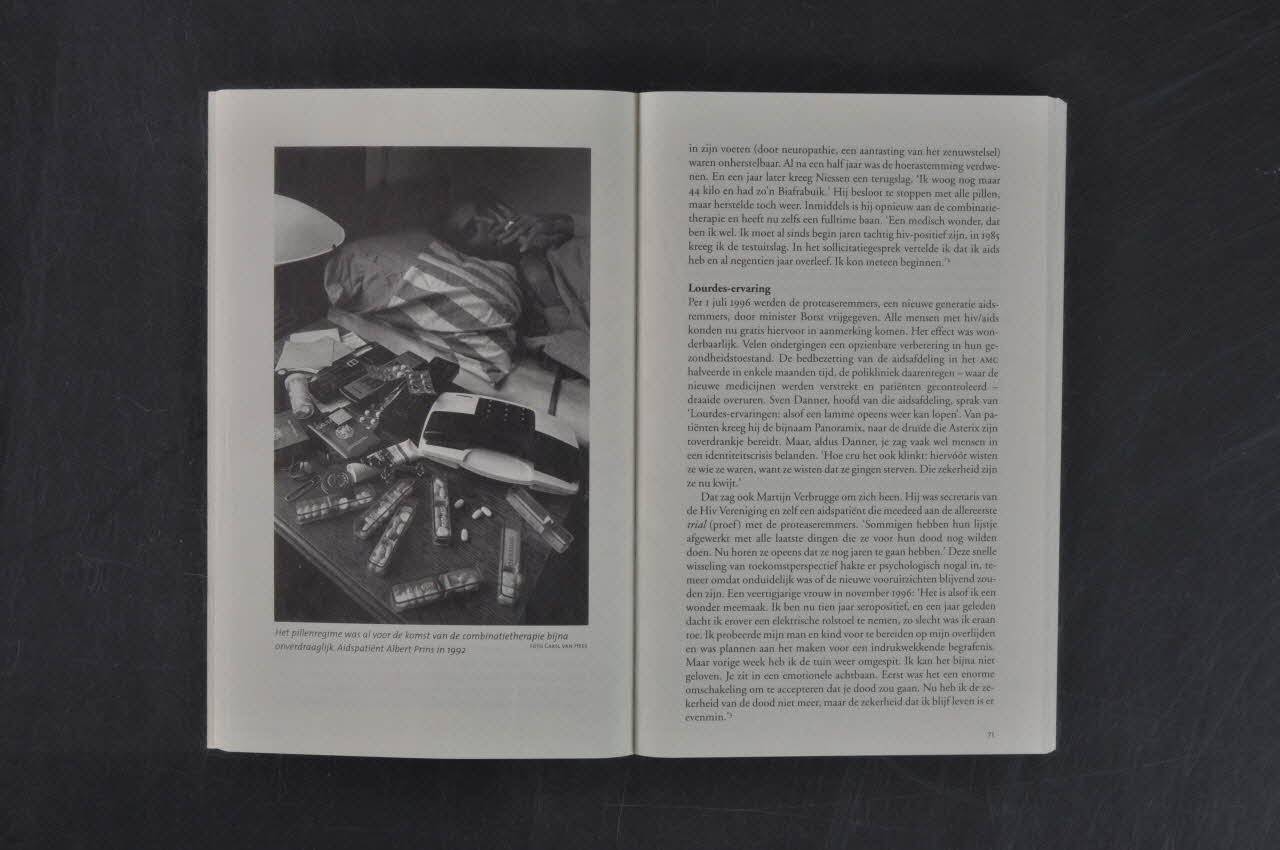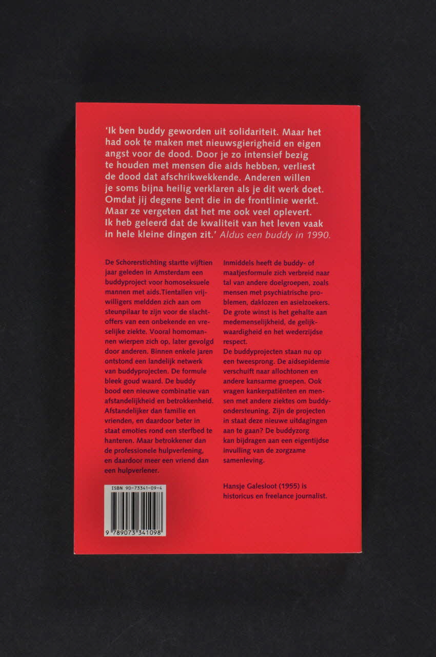 Le livre est illustré de nombreuses photographies noir et blanc : manifestation du 1er décembre, scènes d'accompagnement : marche, soins, quilt, homomonument, deuil / Résumé en anglais dans : 2005.031.03 : "Vriendschap voor een vreemde : Viiftien jaar buddyzorg aan mensen met hiv en aids" (Amitié pour un étranger : 15 ans de "buddy care" en face à face avec des personnes vivant avec le VIH/Sida). "Il y a 15 ans, la Fondation Schorer a mis sur pied un programme d'accompagnement (buddy) pour les homosexuels malades du sida à Amsterdam. Peu de temps après, cela devint un réseau national de programmes d'accompagnement (buddy) et cette formule s'étendit à de nombreux autres groupes comme les personnes ayant des problèmes psychiatriques, les sans logis et les chercheurs d'asile. Le bénéfice principal de cette approche réside dans le haut degré de solidarité, d'égalité et de respect mutuel qu'elle permet. Dans les dernières années, l'épidémie de sida s'est étendue aux minorités ethniques et à d'autres groupes défavorisés. Les malades du cancer, ainsi que d'autres malades ont aussi besoin de ce type de support (buddy). Les projets sont ils capables de répondre à ces nouveaux défis ?"