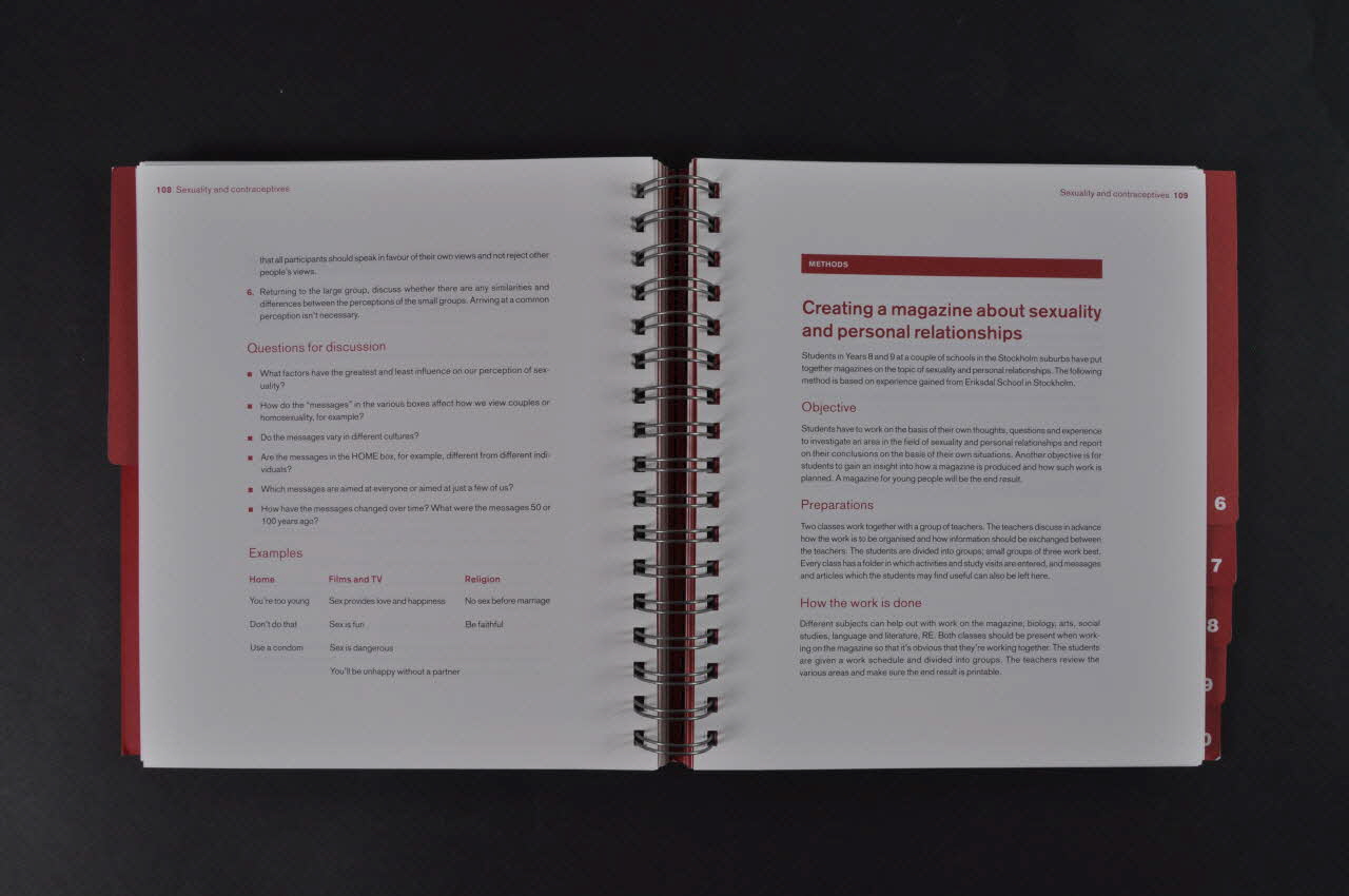 Le corps de texte, rédigé en anglais, est imprimé en noir avec des titres rouges. Il est séparé en dix sections par des intercalaires rouges. La couverture, rouge également, est décorée de quelques traits blancs partiellement entrecroisés. Il s'agit de la version anglaise d'un livre d'abord édité en suédois, destiné aux personnes en relation avec des jeunes, pour les aider à mieux répondre à leurs questions sur les relations personnelles et la sexualité. Le manuel contient à la fois des méthodes pratiques, des exposés d'expériences et des parties plus théoriques.Inscriptions