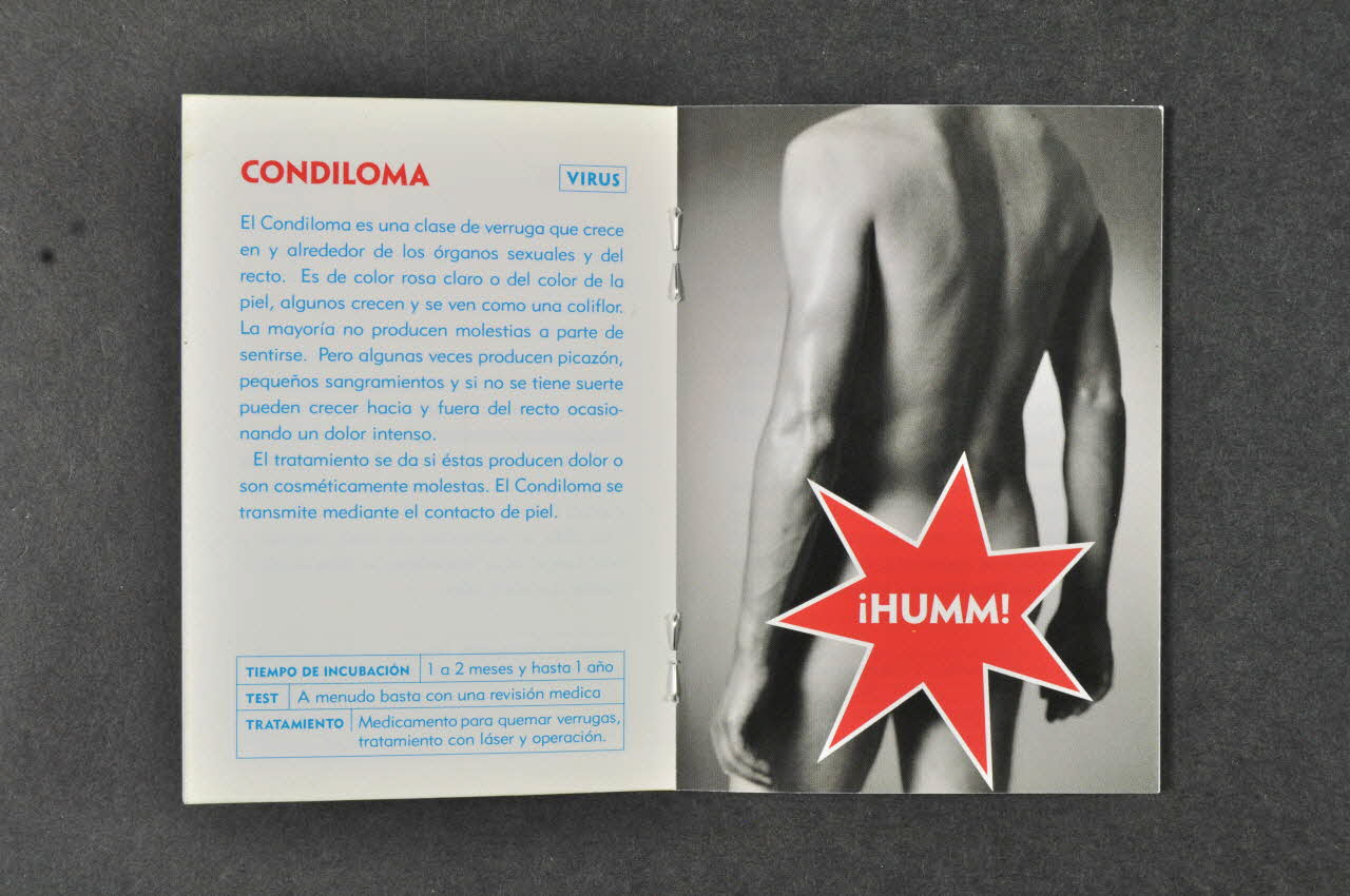 Version suédoise en 2005.034.18, anglaise en 2005.034.66 Les deux premières pages parlent des infections sexuellement transmissibles en général, du fait qu'elles sont souvent invisibles au départ, qu'elle augmentent le risque de VIH. Recommandation de dépistage s'il y a un doute. Insistance sur le préservatif. Pages suivantes : 1 page par infection. Description de l'infection, de ses complications possibles, Tableau avec le test, le traitement, l'usage du préservatif. -Gonorrhée - Chlamydia - Syphilis - Condylome - Hépatites A, B, C - Herpès Lexique Dépistage / Le "tracing" Adresses utiles : cliniques et sites internet