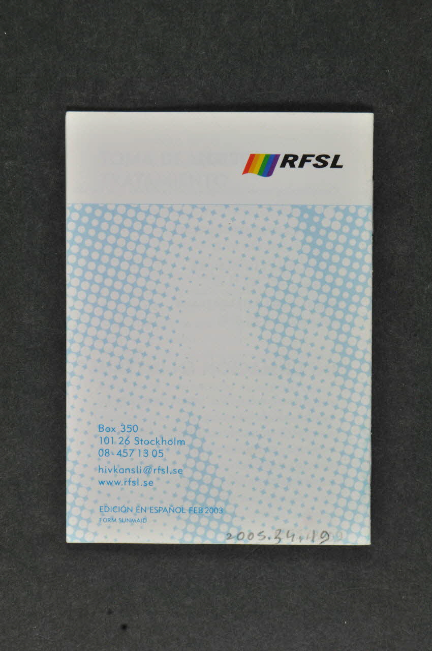 La couverture comporte un fond bleu avec des pointillés blancs sur laquelle se détache une étoile rouge à sept branches inégales au centre. Une inscription en lettres capitales blanches est au milieu de l'étoile. En haut de la page, se trouve un bandeau blanc comportant des petits caractères bleus. En bas à droite, en bleu, figure le nom de l'association. Le dos de la brochure comporte le même fond bleu avec des pointillés blancs. Un bandeau blanc avec à droite le logo de RFSL est situé en haut de la page, et en bas, à gauche, les coordonnées sont inscrits en bleu. L'intérieur de la brochure est doté d'inscriptions en bleu et rouge sur fond blanc. Trois photos de corps masculins nus avec une étoile rouge sur la tête, les fesses et le pénis avec des caractères blancs illustrent trois des pages intérieures de la brochure.Inscriptions