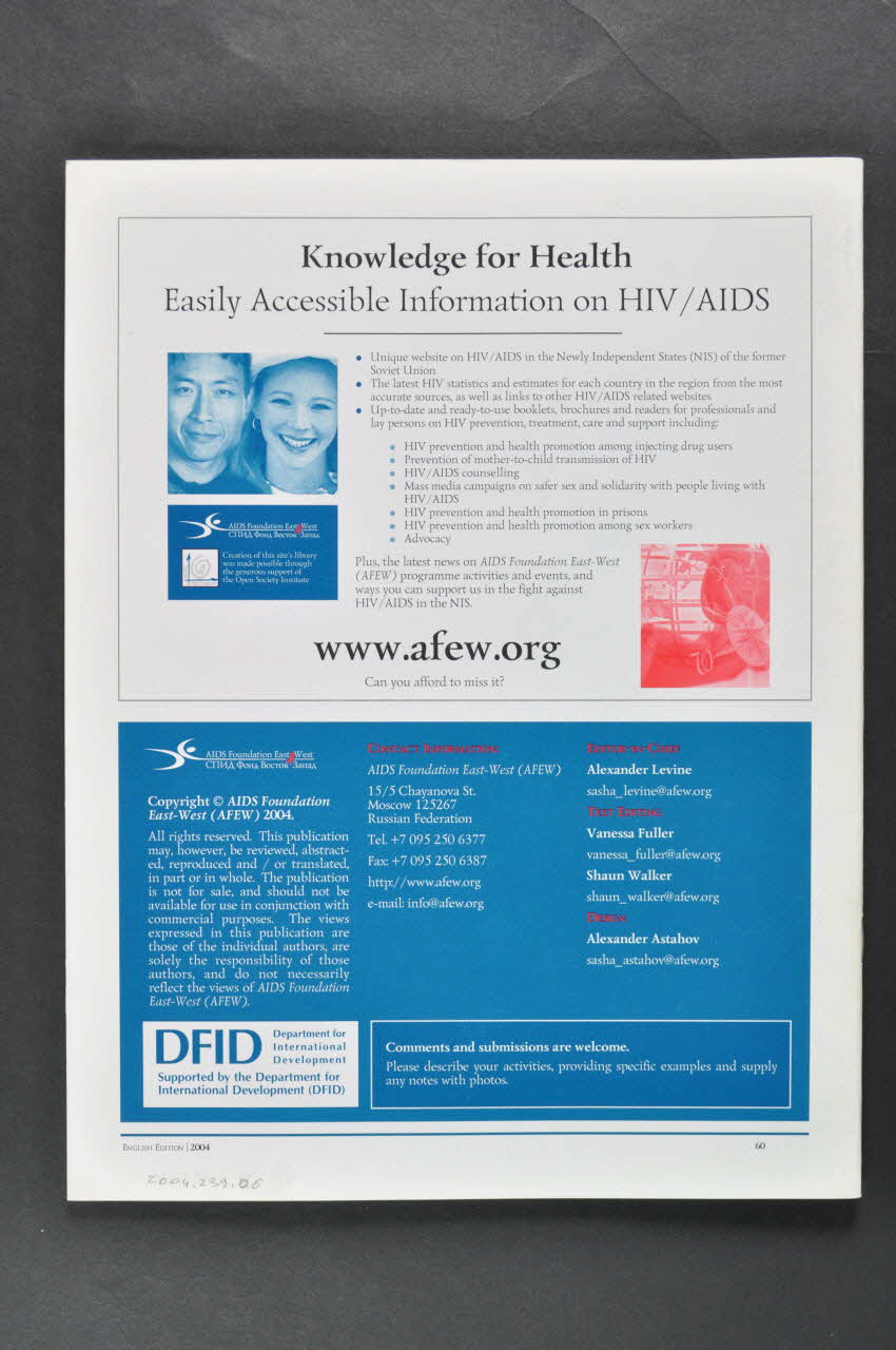Celle-ci présente en haut en capitales bleues puis noires le titre. Au dessus, en petits caractères rouges une indiquation quant à l'édition anglaise. Et en noir, le nom de l'association : Aids Foundation East West. En dessous, en tout petits caractères bleus, les noms de villes concernées. Sur le reste de la page, l'éditorial. La revue se découpe ainsi : p. 2 Sommaire p.3-5 La 14ème conférence internationale sur la réduction des risques en matière de drogues, Chiang Mai, Thailande, du 6 au 10 avril 2003 p.6-23 Prévention du VIH et réduction des risques dans le système pénitentiaire (interviews et expériences dans diverses prisons de la Fédération de Russie) p. 24-36 Le travail d'information du public avec les médias dans différentes villes de la Fédération p. 37- 59 Le travail d'"advocacy" auprès des autorités politiques nationales ou régionalesInscriptions