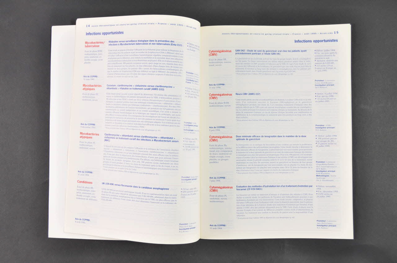 Précisions sur le contenu : Sommaire : - 1. Infection par le VIH : primo-infection (2 essais), transmission mère-enfant (4 essais), pédiatrie (2 essais), antirétroviraux (21 essais) - 2. Infections opportunistes : toxoplasmose (3 essais), tuberculose (1 essai) , mycobactéries atypiques (3 essais), candidose (1 essai), cytomégalovirus (5 essais), herpès (2 essais) , hépatite C (2 essais), cryptosporidiose (1 essai), microporidiose (3 essai) - 3. Pathologies tumorales : lymphome (2 essais), sarkome de Kaposi : (5 essais). - 4. Immunithérapie / vaccin : immunithérapie (3 essais), vaccins (6 essais) - 5. Autre : neutropénies (1 essai), diarrhées chroniques (2 essais), nutrition (3 essais), qualité de vie (1 essai).