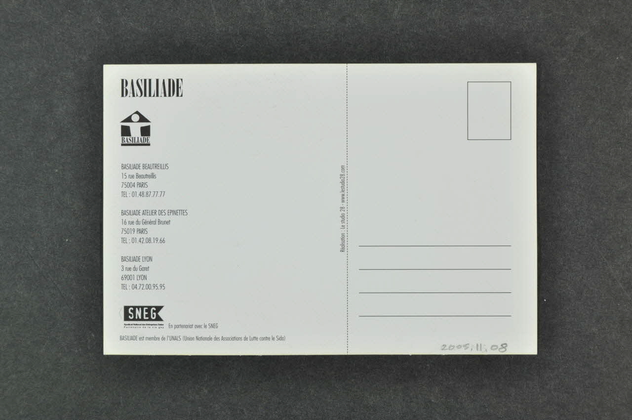 SNEG // Syndicat National des Entreprises Gaies // Partenaire de la vie gay (Logo constitué de quatre initiales imprimées en capitales blanches dans un ruban noir. En-dessous, deux lignes de textes imprimées en petits caractères noirs.), versoBASILIADE (Logo de l'association Basiliade imprimé en noir et situé sur le bord gauche. Ce dernier représente le haut d'une sihouette blanche placée dans une forme géométrique schématisant une maison. Dans le bas est écrit le nom de l'association en lettres capitales.), versoTitre