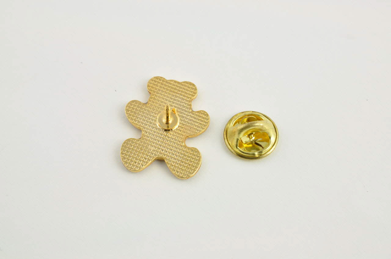 Métal moulé émaillé. / Petit pin's en métal doré ayant la forme d'un ours brun clair, au nez et pattes brun plus foncé. Sur son flanc gauche est dessiné un grand ruban rouge.Décor