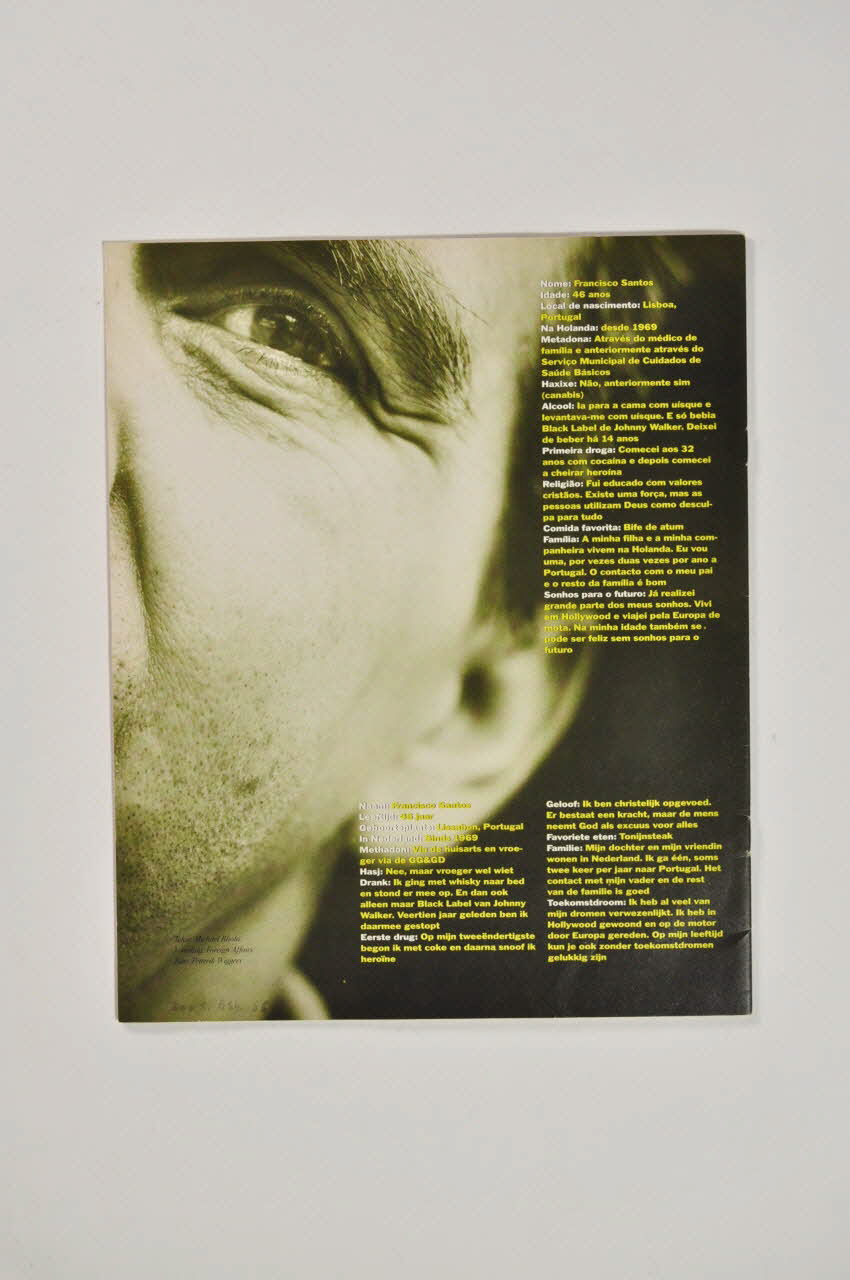 Au recto le fond est une photo colorée en jaune. Elle représente un visage féminin. En haut, dans un ovale jaune cerclé de blanc et noir, est inscrit le nom de la revue en capitales puis italiques noires. En dessous figure un sous titre. Au milieu il y a quatre titres en capitales blanches, accompagnés de quatre sous titres en jaune. A l'intérieur, le fond est blanc, avec des textes en noir, accompagnés de nombreuses photos, en noir et blanc, représentant des personnes. Au verso, le fond est une photo jaune. Elle représente un l'oeil et la joue d'un homme. Dans la partie basse et à gauche, se trouvent des textes en petites lettres blanches et jaunes.Inscriptions