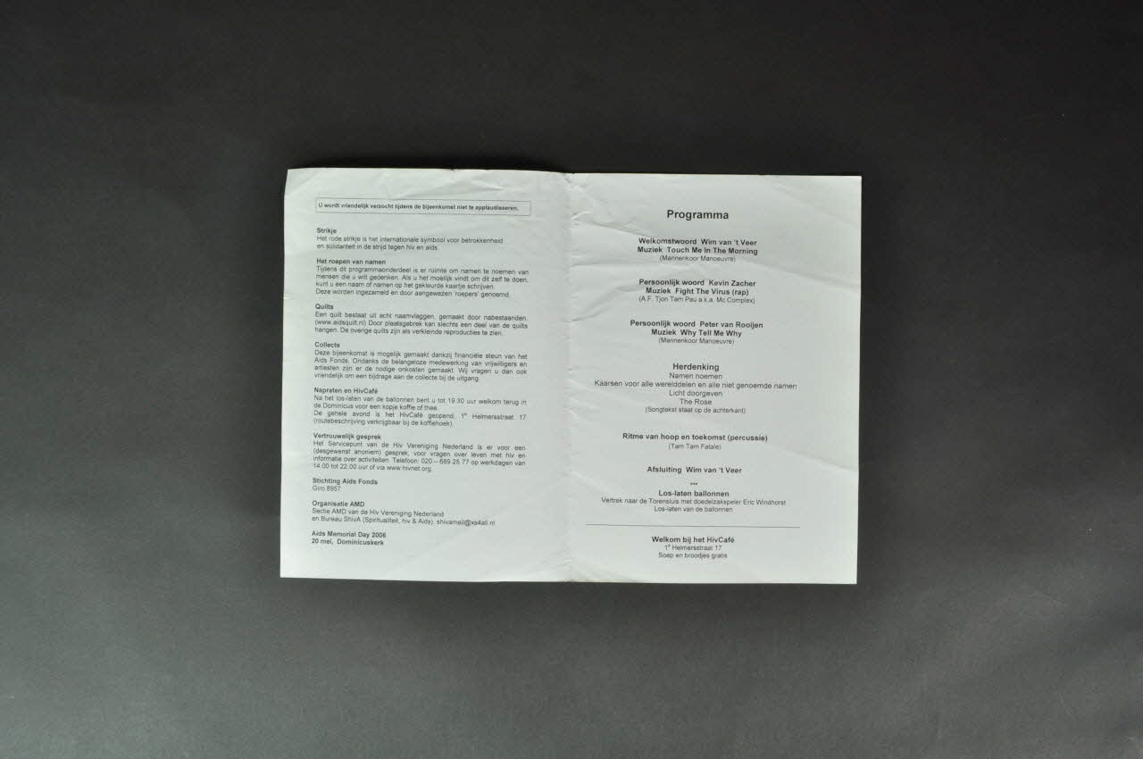 .1 : C'est une feuille en papier glacé au format A4 pliée en deux. Sur la couverture on peut voir des bougies allumées sur un fond rouge : elles reprennent le motif du ruban rouge, il y a aussi la mention du lieu et de la date de la manifestation en bas. Verticalement, à gauche, en caractères jaunes il y a le titre et la date. Dans ce fascicule on trouve le programme de cette journée. Le dos a un fond jaune, un texte est imprimé en noir, il s'agit d'un chant en trois strophes (en anglais) qui est chanté pendant la cérémonie (sur la mort et la renaissance).