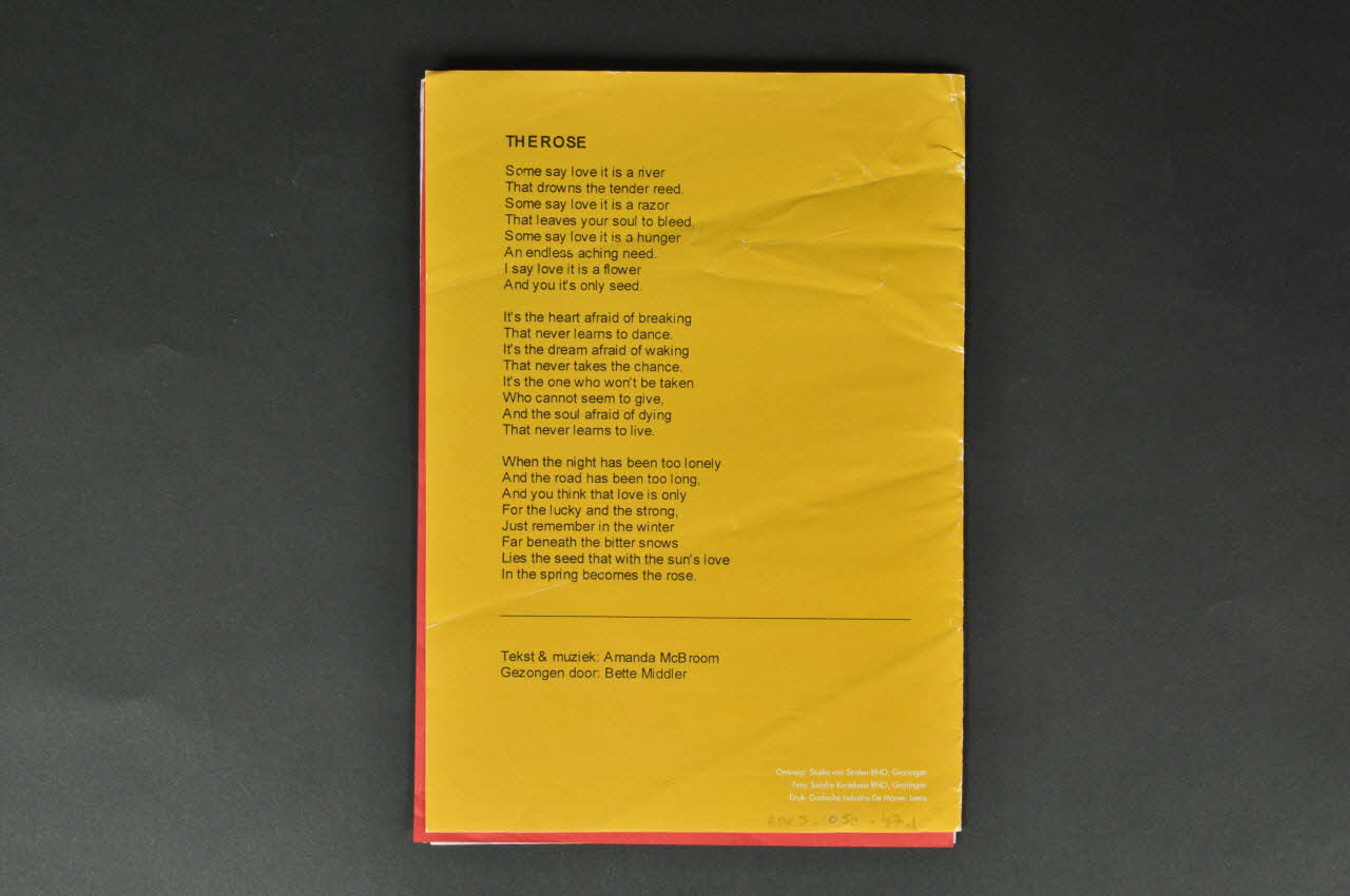 .2 : Petite feuille au format A5 en papier glacé, il s'agit d'une publicité pour un livre. Imprimée sur une seule face, un bandeau noir se trouve en haut et en bas. Celui du haut présente le livre (avec une photo à côté), dans celui du bas on trouve les coordonnées de l'éditeur. Un texte en noir sur fond blanc présente le livre en néerlandais.