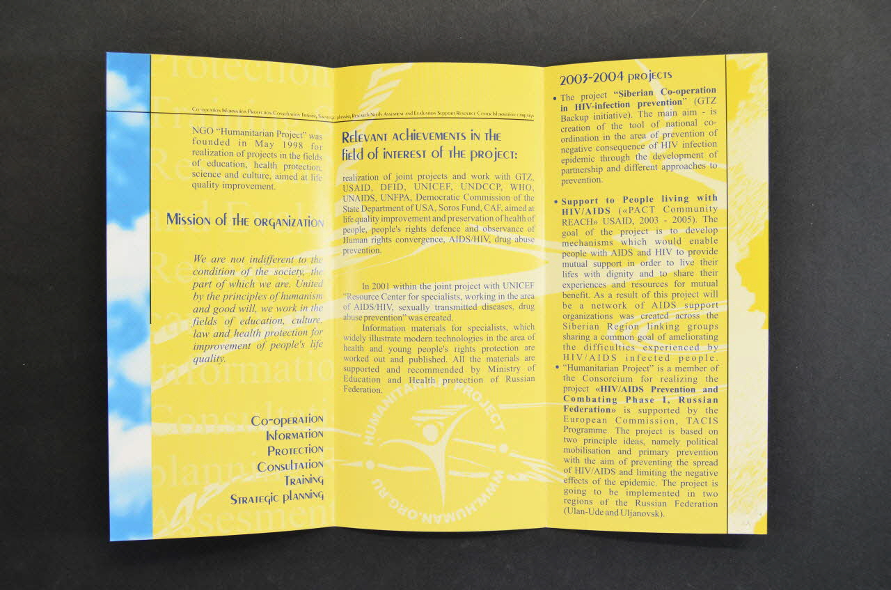- Mission of the organization // - Relevant achievements in the field of interest of the project // - 2003-2004 projects // - Strategic tasks of NGO // "Humanitarian Project" (inscriptions en bleu), à l'intérieurLogo