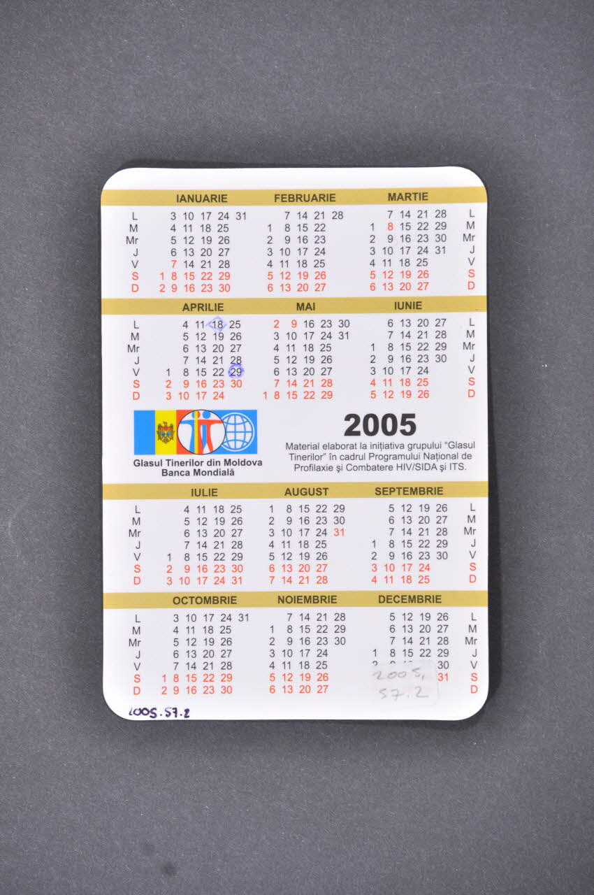 Le recto présente un fond brun clair avec le mot SIDA en sous impression. Du haut en bas de la carte, figure une série de silhouettes alternées hommes et femmes, en cinq rangées. les trois premières rangèes sont rouges et les deux suivantes blanches. Au centre, figure une inscription sur deux lignes, en rouge et noir. Une autre inscription se situe en partie inférieure. Le verso présente un fond blanc avec un calendrier sur quatre lignes, en rouge et noir. Les mois, inscrits en noir, sont surlignés en marron. Au centre figure un logo et une date.Inscriptions