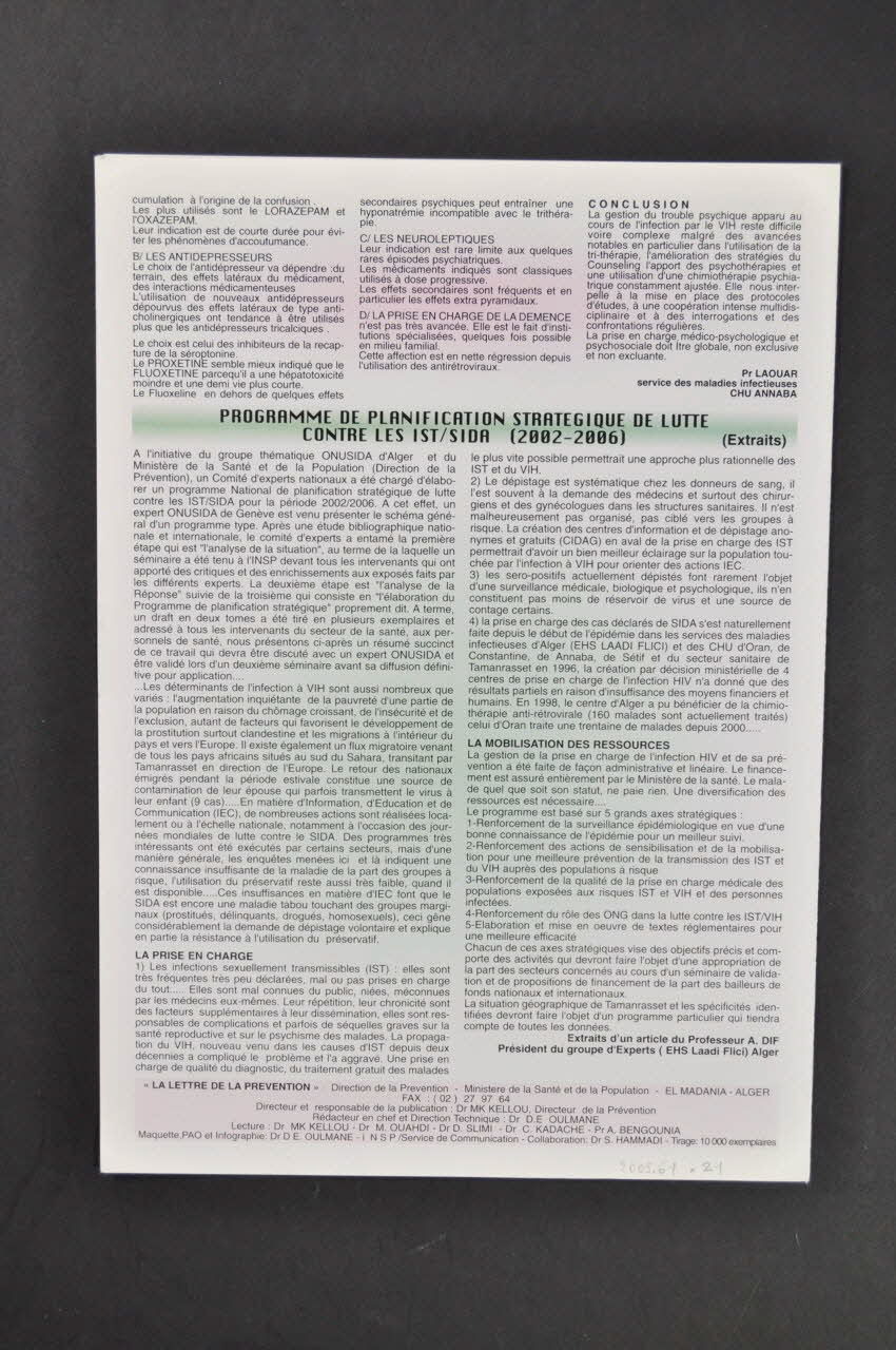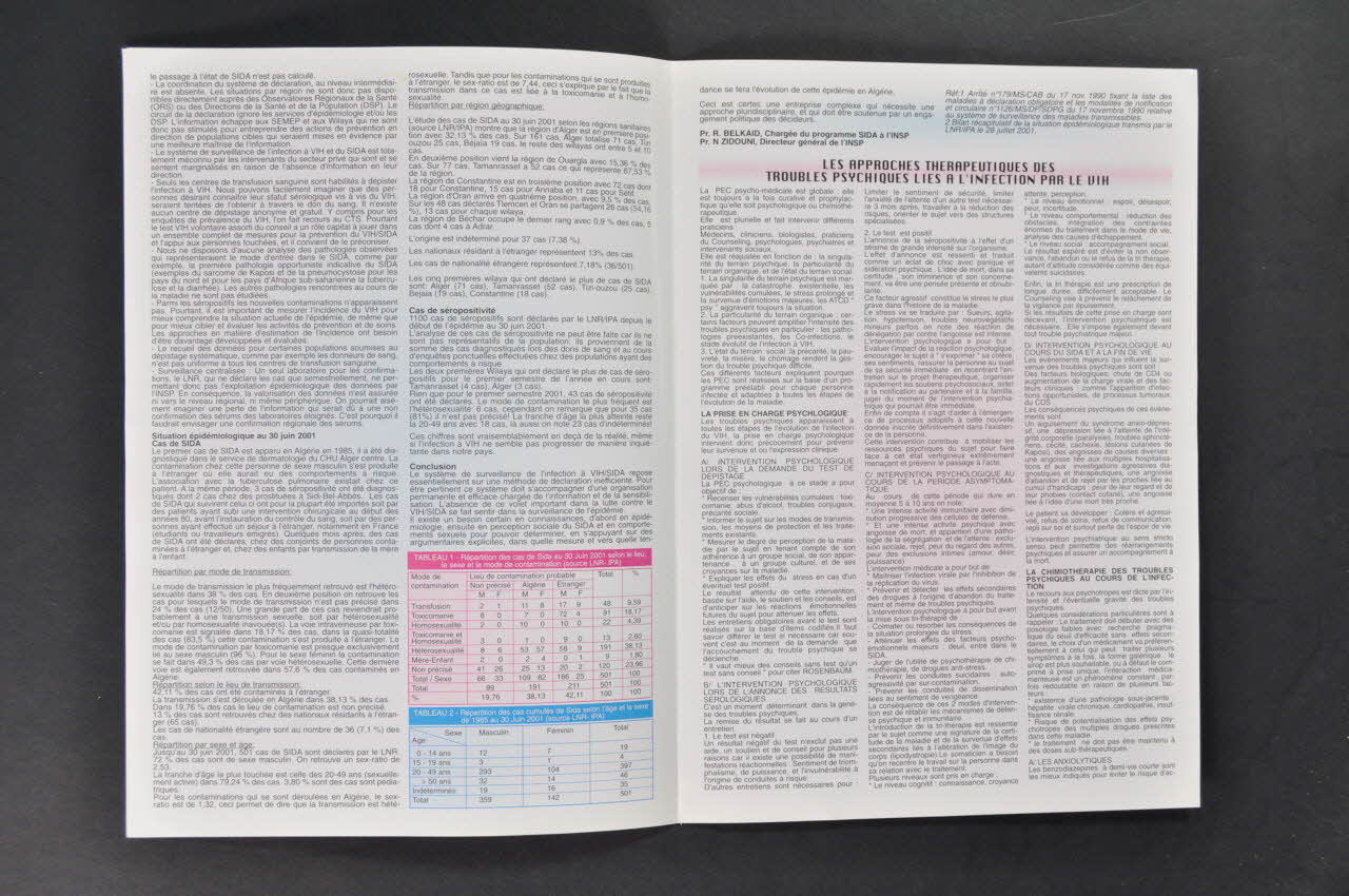 Résumé: p.1 Editorial. Le texte de l'éditorial signé par le Dr M.K Kellou, directeur de la Prévention est sur toute la colonne de gauche, en noir sur fond rose pâle : bilan des actions en 2001 au niveau international et national. En dessous :"L'infection à VIH/Sida en Algérie : le point sur la surveillance". Article du Pr. R. Belkkaid, chargée du programme SIDA à l'INSP et du Pr. N.Zidouni, directeur général de l'INSP. Données épidémiologiques au 30 juin 2001. Critique du système de surveillance. pas de centre de dépistage sinon dans les centres de transfusion sanguine. Article se poursuivant p. 2 et 3. p.3-4 Les approches thérapeutiques des troubles psychiques liés à l'infection par le VIH. Pr. Laouar, service des maladies infectieuses CHU Annaba - p.4 Programme de planification stratégique de lutte contre les IST/Sida (2002-2006) Extraits. Article sur deux colonnes, en noir sur fond vert pâle : prise en charge du diagnostic et du traitement des IST, création de centres de dépistage, mobilisation des ressources.