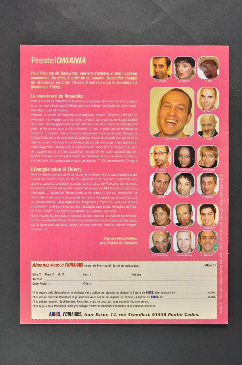 Au dos, sur un fond rose, on trouve un texte en caractères blancs et jaunes (sous titres) : changement de rédacteur en chef de la revue : Thierry Prestel passe le flambeau à Dominique Thiéry. Hommage à l'ancien rédacteur en chef appelé à d'autres fonctions dans l'association. A droite : dix-huit vignettes couleur présentent des photographies type photo d'identité de l'équipe rédactionnelle. En bas, sur un bandeau blanc, se trouve un bulletin d'abonnement.