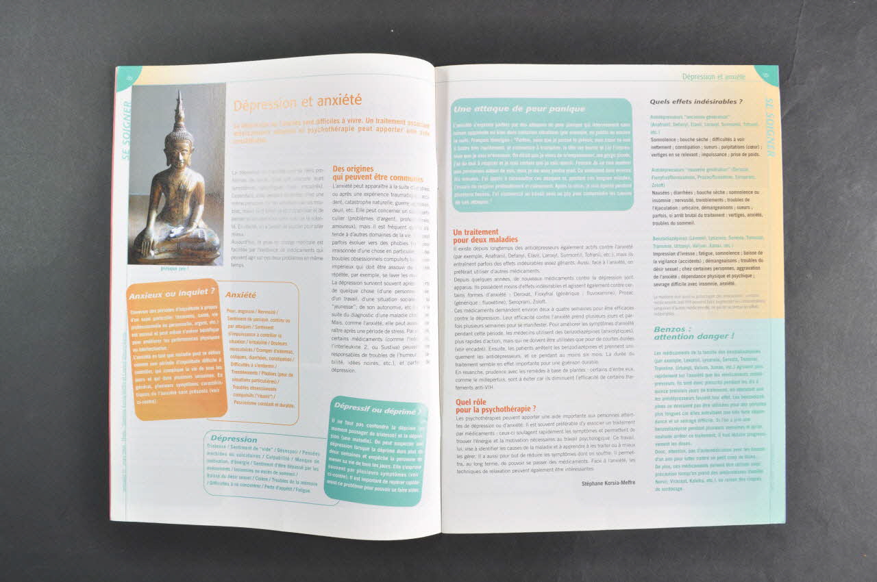 p. 8-9 Fond blanc, brun ou vert. Impression en noir, brun, blanc sur fond brun ou vert. Dépression et anxiété. Définitions. Traitements et effets indésirables des traitements. (Titre de l'article en couverture)