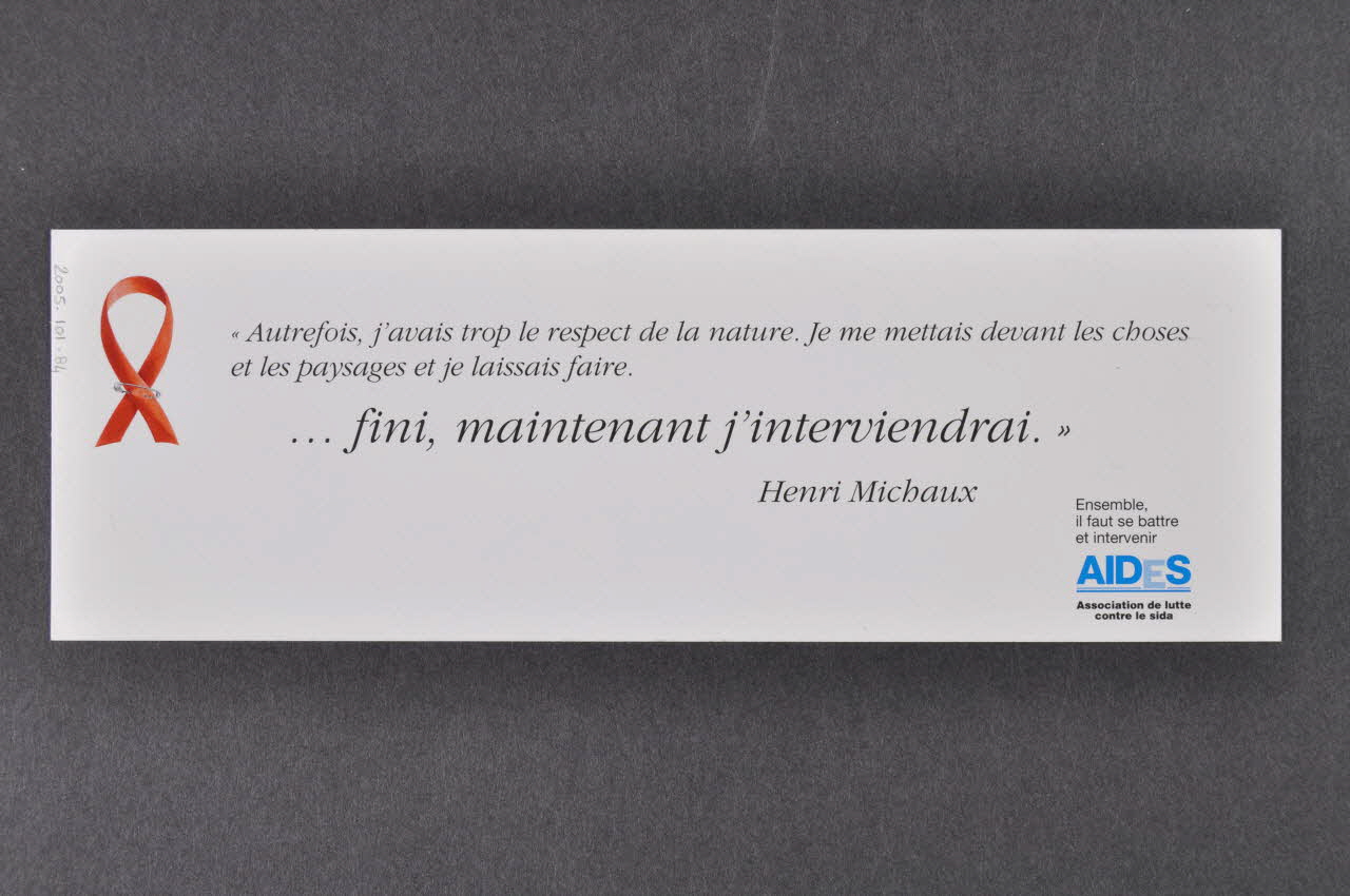 Signet : ruban rouge et texte de Henri Michaux, en basSlogan