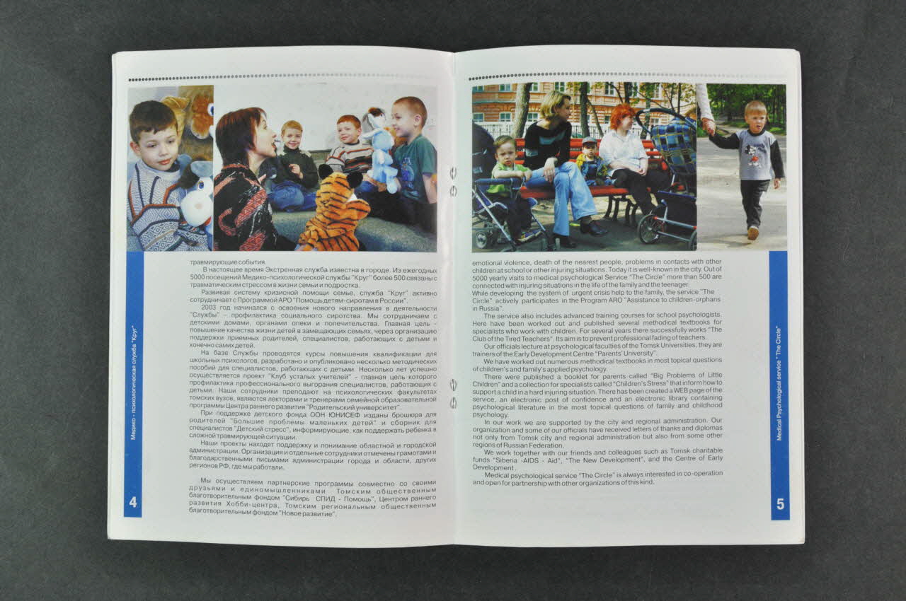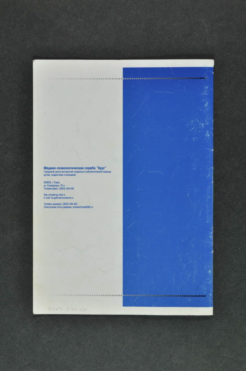 Brochure du centre médico psychologique de Tomsk : "Krug" (Le titre est marqué sur la première de couverture, dans la partie centrale à gauche.), sur la couvertureAdresse