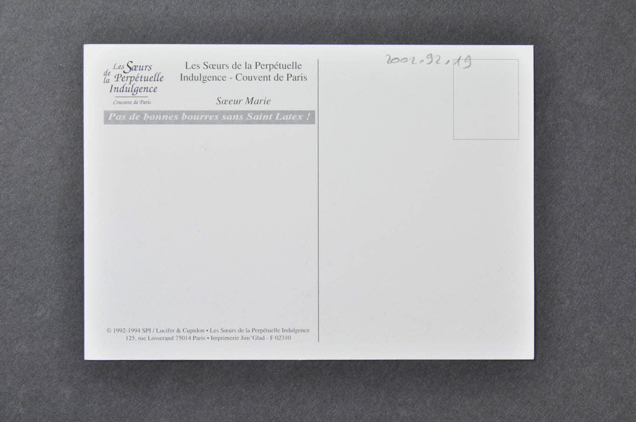 © 1992-1994 SPI/ Lucifer & Cupidon, "Les Soeurs de la Perpétuelle Indulgence. 125 rue Losserand 75014 Paris . Imprimerie Jim"Glad - F 02310 (en bas à gauche), versoSlogan
