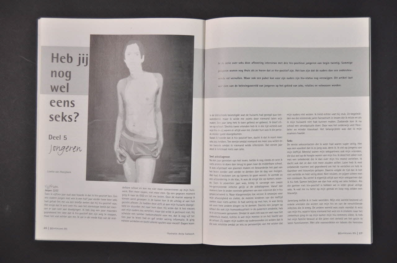 Revue de l'association HIV VERENIGING tirée à 2500 exemplaires. Traduire les titres. - p.4-5 Bezuinigingen op de zorg Cf illustration de la couverture et annonce en couverture. -p.6-7 Verenigingsnieuws. Nouvelles de l'association. - p.8-10 Het nieuwe stelsel van arbeidsongeschiktheidsregelingen. Sober of somber ? - p.11 Marihuana bij apotheek - p.12-15 Interview. Van sommigen herken ik iets - p.16-17 Hiv Vereniging start tevredenheidsmeting hiv-behandling - p.18-20 Condooms en zo - p.21, 30 Brèves ( dans le monde) - p.22 Critique de livre : "Je leeft nu" - p.23 De spiegel - p.24-25 Eindelijk behandeling in Zuid-Afrika - p.26-29 Heb jij nog wel eens seks ? Deel 5 Jongeren - p.29 Geneesmiddelen overeenkomst amper verbetering. - p.30 BD Beleen ww Toekkomst - p.31 Lettre de lecteur : Gespetter - p.32-34 Eenmaal daagse combinaties - p.35 Levensverzekkeringen voor hiv-positieven. Onderzoekk naar levensverwachting - p.36-38 Party Smarty. Interacties tussen recreatieve drugs en hiv-remmers. - p.39, 43 Brèves sur les traitements - p.40-42 Je geld of je kkop ! Maskkeren van lipoatrofie - p.44 In Memoriam Martin Schipper - p.9-11 Juridische Kroniek 2. - p.44 Nouvelles de l'association. - p.45-47 Activités de l'association et d'autres associations, agenda.