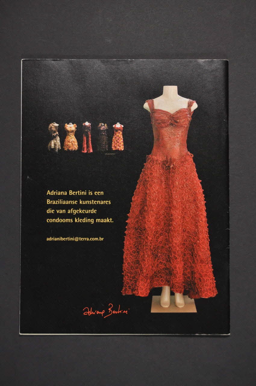 Adriana Bertini is een // Braziliaanse kunstenares // die van afgekeurde // condooms kleding maakt. (Texte en lettres jaunes au dos de la revue), au centreDécor