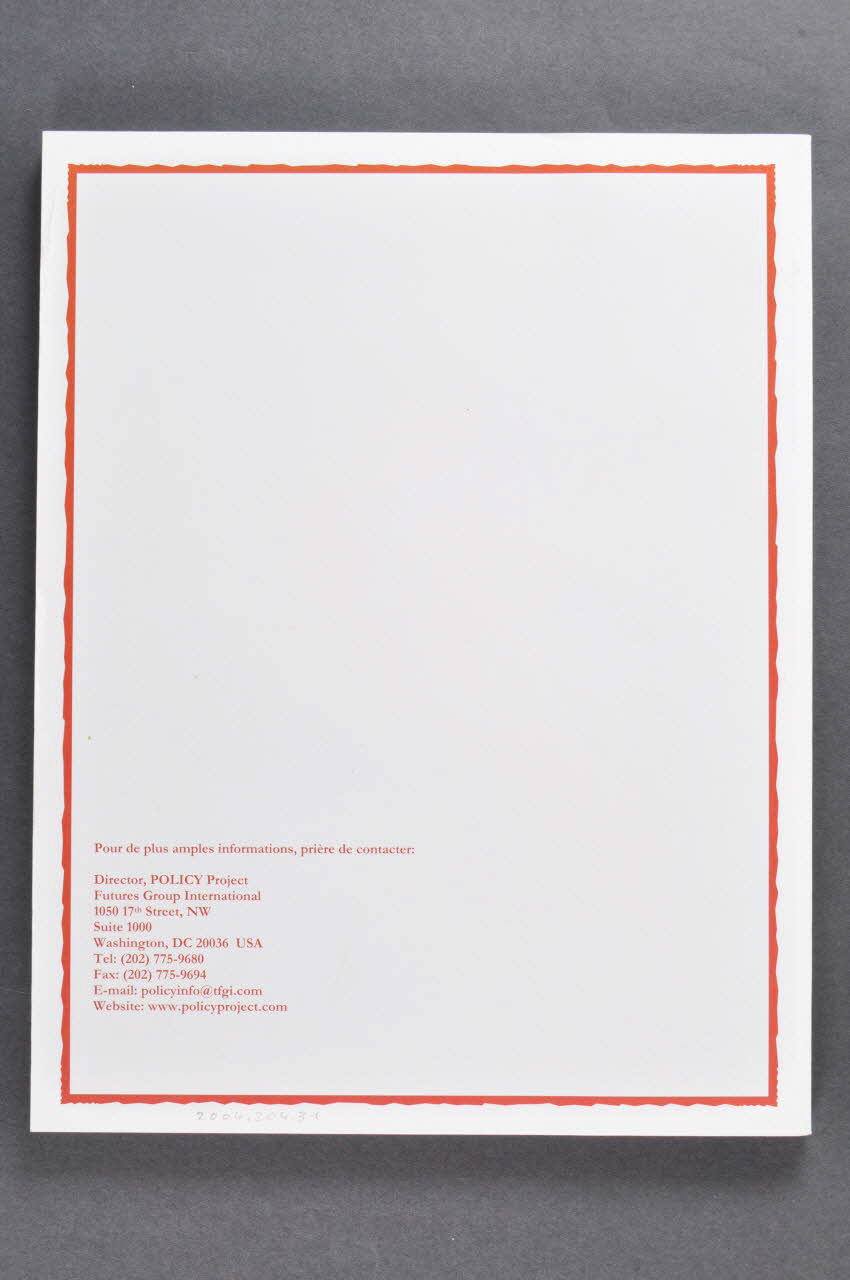 Brochure de format A4, de 140 pages de papier blanc reliées par collage sous une couverture cartonnée blanche. Au centre figure le titre par dessus un ruban rouge, et à gauche, un bandeau jaune porte le nom de nombreux organismes.