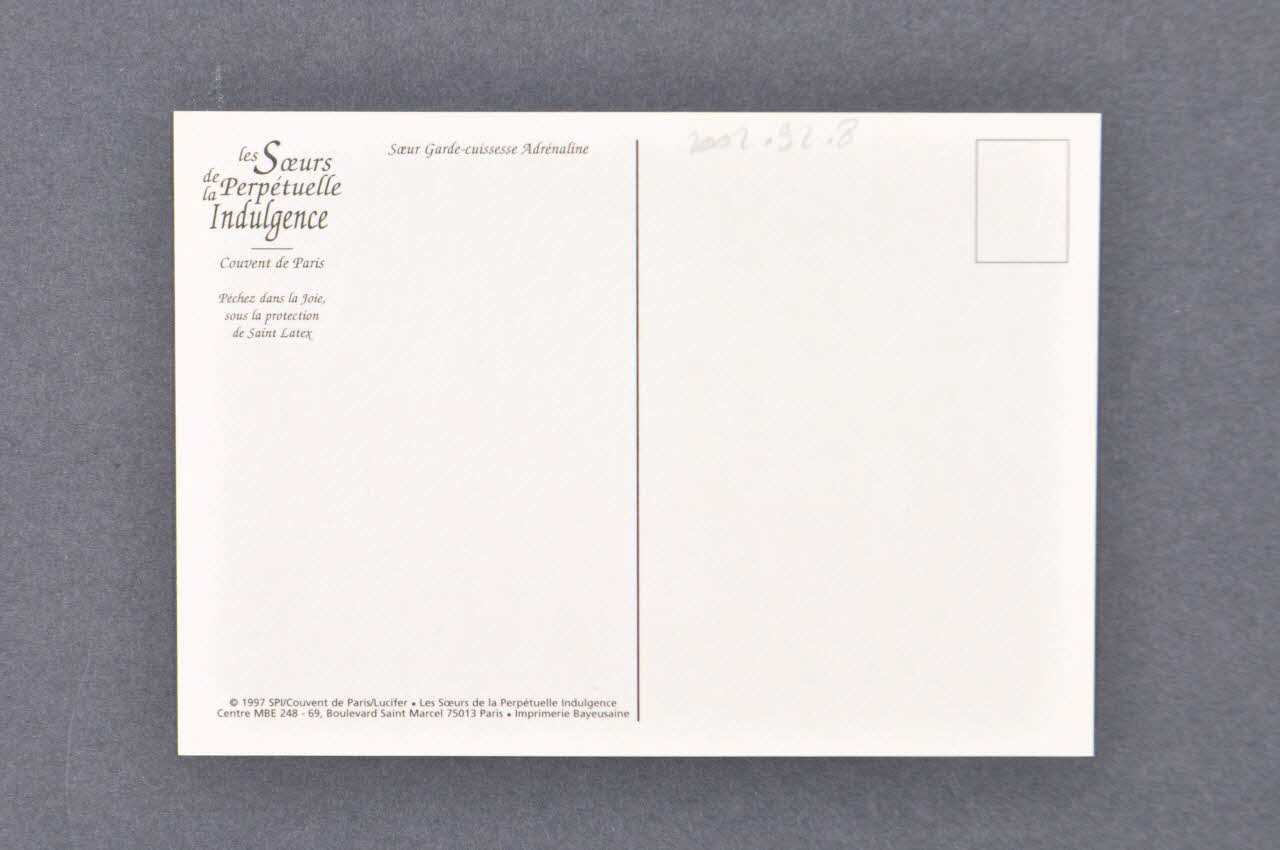 Lieu : Paris, Ile-de-France, FranceDate : 1997Carte postale faisant partie d'un lot de 8 cartes intitulées "Lucifer". Ces cartes représentent certaines des soeurs dans leur « personnage ». Ce sont aussi des produits dérivés, vendus pour apporter des fonds à l’association. Quelques soeurs adoptent un personnage ayant des traits masculins, ils sont alors nommés « garde-cuisses » ou « garde cuissesses ».