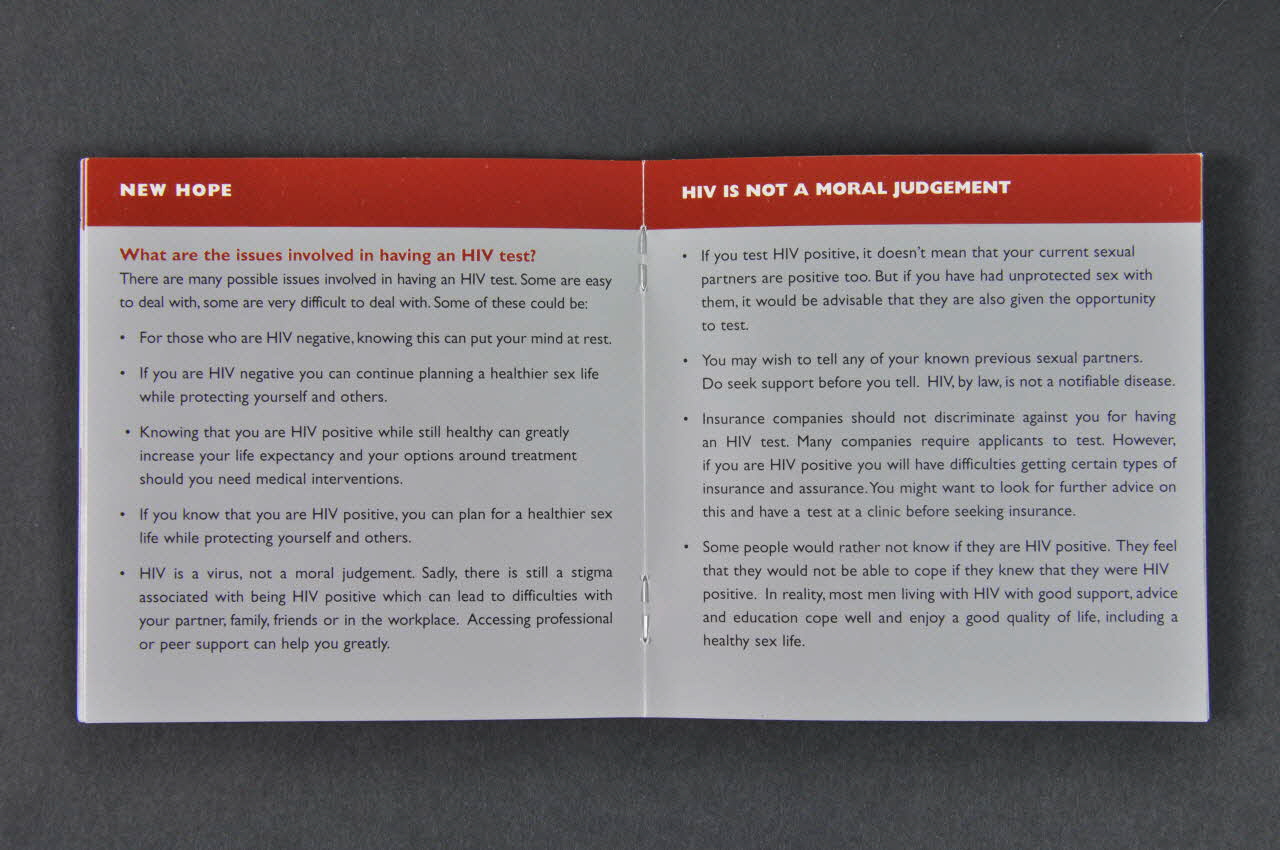 HIV testing information for gay and bisexual men (inscription en blanc sur bandeau noir en bas de page), sur la couvertureLogo