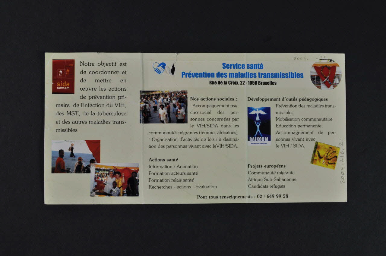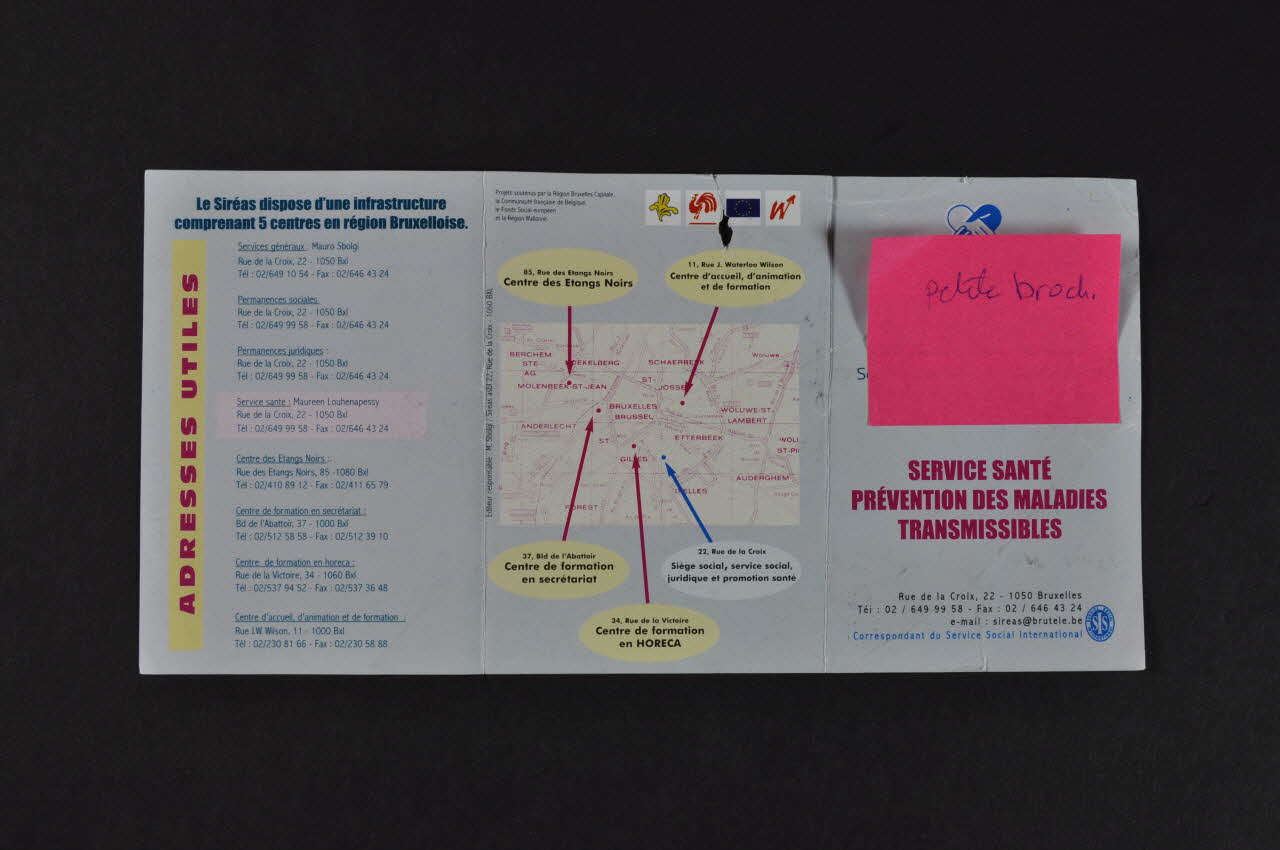 Siréas / Service international de Recherche, d'Education et d'Action Sociale. (Sur la couverture.)Notre objectif est de coordonner et de mettre en oeuvre les actions de prévention primaire de l'infection du VIH, des MST, de la tuberculose et autres maladies transmissibles. (Texte du feuillet 1.)Service santé / Prévention des maladies transmissibles / Rue de la Croix, 22 - 1050 Bruxelles (Sur l'intérieur.)petite broch. (Note adhésive repositionnable, en papier rose, collée sur l'avant de la brochure. Elle est inscrite au stylo à bille bleu.)SERVICE SANTE / PREVENTION DES MALADIES / TRANSMISSIBLESNos actions sociales : Accompagnement psycho-social des personnes concernées par le VIH/SIDA dans les communautés migrantes (femmes africaines) / Organisation d'activités de loisir à destination des personnes vivant avec le VIH/sida // - "Actions santé : Information - Animation / Formations acteurs santé / Formation relais santé / Recherches-actions Evaluation" (Feuillet 2-)Décor