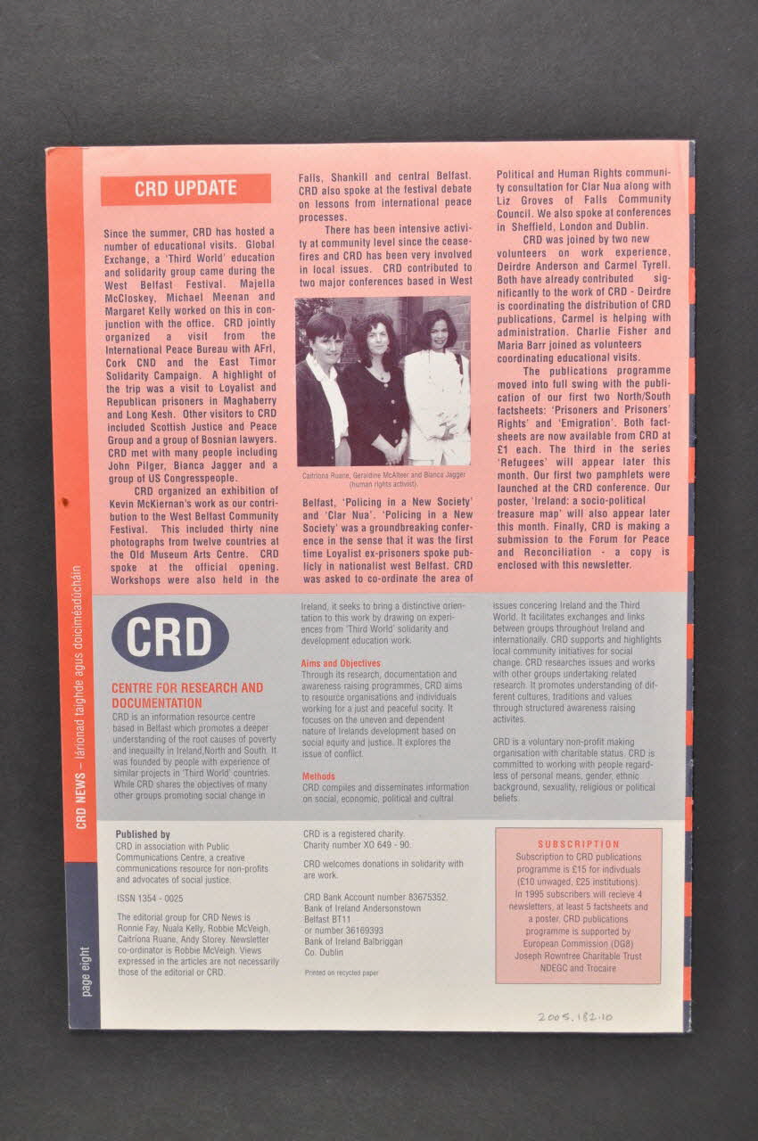 Published by // CRD in association with Public // Communications Centre, a creative // communications ressource for non-profits // and advocates of social justice // (...) // CRD is a registered charity. // (...) // CRD welcomes donations in solidarity with // are work. (Devant du bandeau blanc du verso.), versoBliain Ur // Shona Duit // // Happy New // Year // // Feliz Año // Nuevo // // CRD NEWS-the newsletter of the centre for research and documentation // // page one (Sur le côté droit en blanc.)Décor
