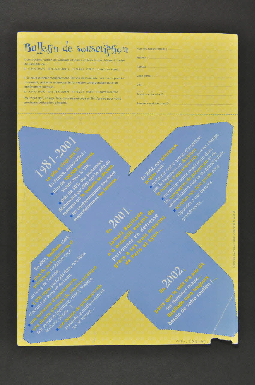 1981-2001 Le sida a vingt ans !!! En France aujourd'hui : plus de 100.000 personnes vivent avec le VIH / près de 50% des personnes découvrent qu'elles ont le sida au moment où la maladie se déclare / les contaminations touchent majoritairement des femmes. // // En 2001, Basiliade c'est : plus de cent volontaires et animateurs mobilisés tout au long de l'année / 6.000 repas partagés dans nos lieux d'accueil de Paris et de Lyon / une quinzaine d'appartements / une dizaine d'ateliers de création artistique par semaine (peinture, chant, théâtre, écriture, photo...) / une équipe de professionnels présente quotidiennement sur le terrain // // En 2002, nos principaux projets sont : renforcer notre action d'insertion en doublant le nombre d'appartements pris en charge / intensifier notre implication dans les campagnes de prévention et de sensibilisation auprès du grand public / accroître nos dons privés pour répondre à nos besoins grandissants // // En 2001, jamais Basiliade n'a accueilli autant de personnes en détresse grâce à ses trois maisons de Paris et Lyon // // En 2002, parce que le sida n'a pas dit ses derniers maux... Basiliade aura toujours besoin de votre soutien !..., versoTitre