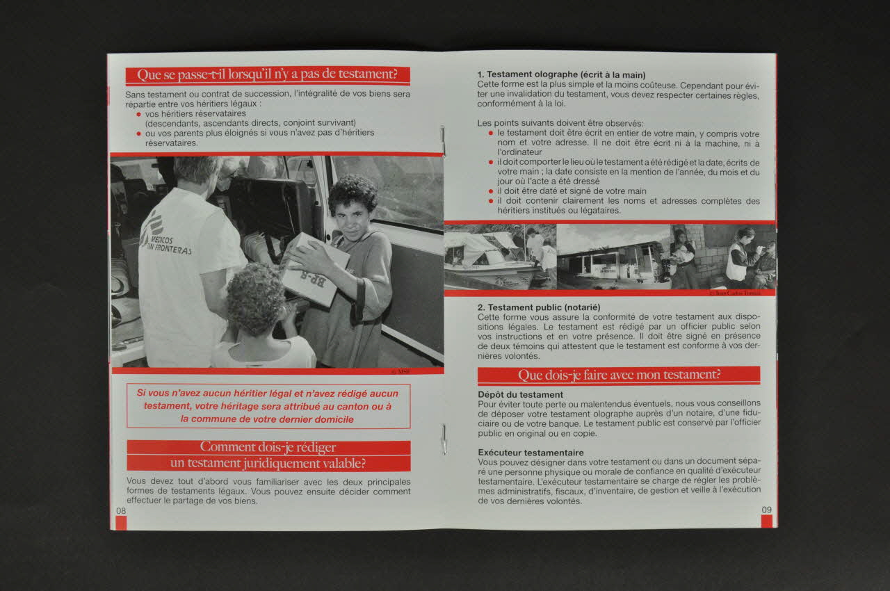 Sommaire // // Qui sont les Médecins Sans Frontières ? // Un legs en faveur de Médecins Sans Frontières // Pourquoi un testament ? // Que se passe-t-il lorsqu'il n'y a pas de testament ? // Comment dois-je rédiger un testament juridiquement valable ? // Que dois-je faire avec mon testament ? // De quoi puis-je disposer ? [...] // Puis-je exclure quelqu'un de mon héritage ? // Puis-je modifier mon testament ? // Est-ce que Médecins Sans Frontières doit payer des impôts de succession ? // Qu'est-ce qu'un contrat de succession ? // Que signifie la faculté de substitution ? // Comment les bénéficiaires sont-ils informés de mes dernières volontés ? // Qui peut m'aider davantage ? // Et si je ne souhaite pas de fleurs pour mon enterrement ? // Puis-je aussi faire une donation ? // Où puis-je obtenir de plus amples informations sur Médecins Sans Frontières ? (première page), à l'intérieurLogo, nom d'association