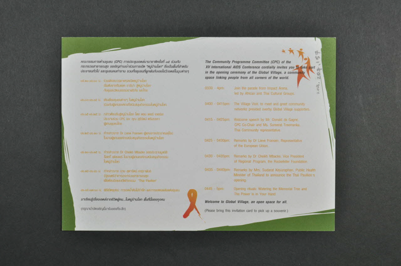 Invitation to Global Village's Opening ceremony // [...] // At Global Village, Hall 10, Impact Convention Centre. (Imprimé en blanc dans la moitié supérieure), rectoConcernant la date