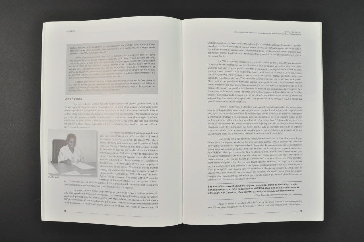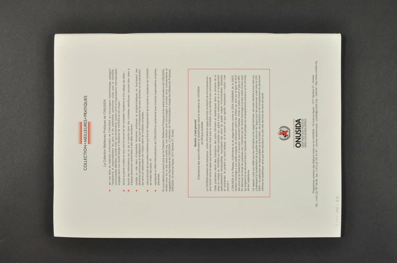 Sur la couverture, le fond est blanc, et présente trois photographies d'infirmières . Au dessus,le titre est imprimé en noir, dont une partie entre deux traits rouges. En haut se trouve le logo d'ONUSIDA à gauche et le logo de SANNAM à droite. A l'intérieur, le texte est noir et est ponctué de photographies en noir et blanc. A l'arrière, la couverture présente un texte en noir dont une partie est encadrée d'une ligne rouge. Le logo d'ONUSIDA est en bas.Décor