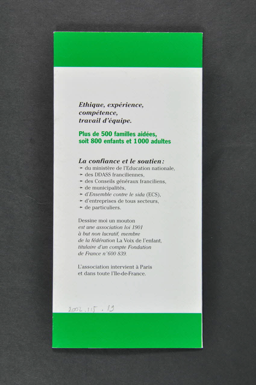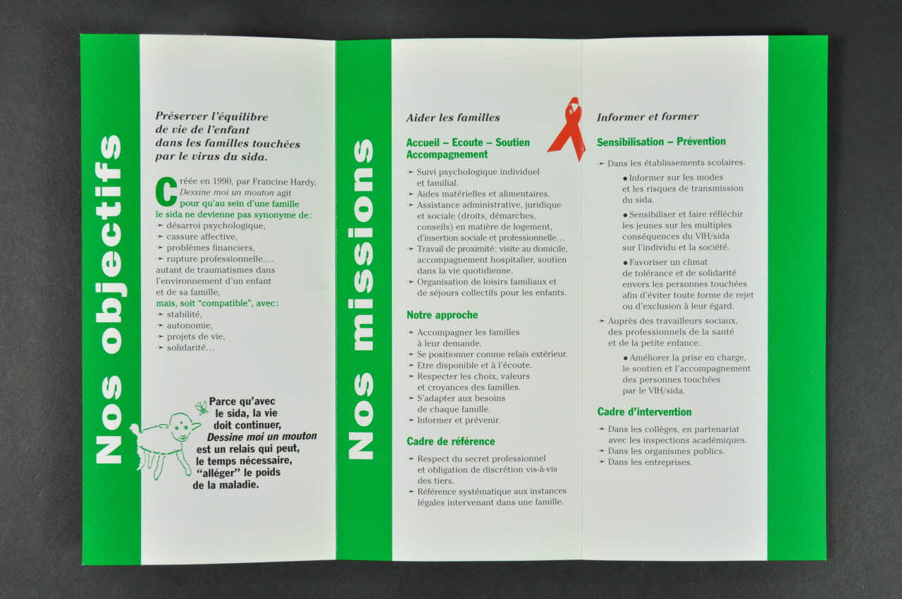 Créée en 1990 par Francine Hardy, Dessine-moi un mouton agit pour qu'au sein d'une famille, le sida ne devienne pas synomyme de (en vert) (...) mais soit "compatible", avec : (en vert (...) logo de l'association et, en gras : "parce qu'avec le sida, la vie doit continuer, Dessine-moi un mouton est un relais qui peut, le temps nécessaire, "alléger" le poids de la maladie." Volets 2 et 3 Sur bandeau vert, en caractères blancs, verticalement, à gauche :"Nos missions" texte sur fond blanc : Aider les familles Accueil - Ecoute - Soutien - Accompagnement (en vert)(...) Notre approche (en vert) (...) (disponibilité, respect...) Cadre de référence (en vert) (...) (secret professionnel, instances légales...) Informer et former Sensibilisation - Prévention (en vert) (...) - dans les établissements scolaires (...) - auprès des travailleurs sociaux et des professionnesl de la santé et de la petite enfance (...) Cadre d'intervention (en vert) Entre les feuillets 2 et 3 dessin d'un ruban rouge Verso du volet 3 Sur bandeau vert, en caractères blancs, verticalement, à gauche : "Nos moyens" texte sur fond blanc : Une équipe (en vert) (...) professionnels salariés et bénévoles formés (...) Une structure conviviale (en vert) La "maison ouverte" : un accueil parents-enfants pour se rencontrer, se détendre, parler ou écoute, et des espaces réservés aux entretiens individuels. Une collaboration avec de nombreux partenaires (en vert) (...) En bas deux photos noir et blanc superposées, dont l'une colorées en vert, du lieu d'accueil