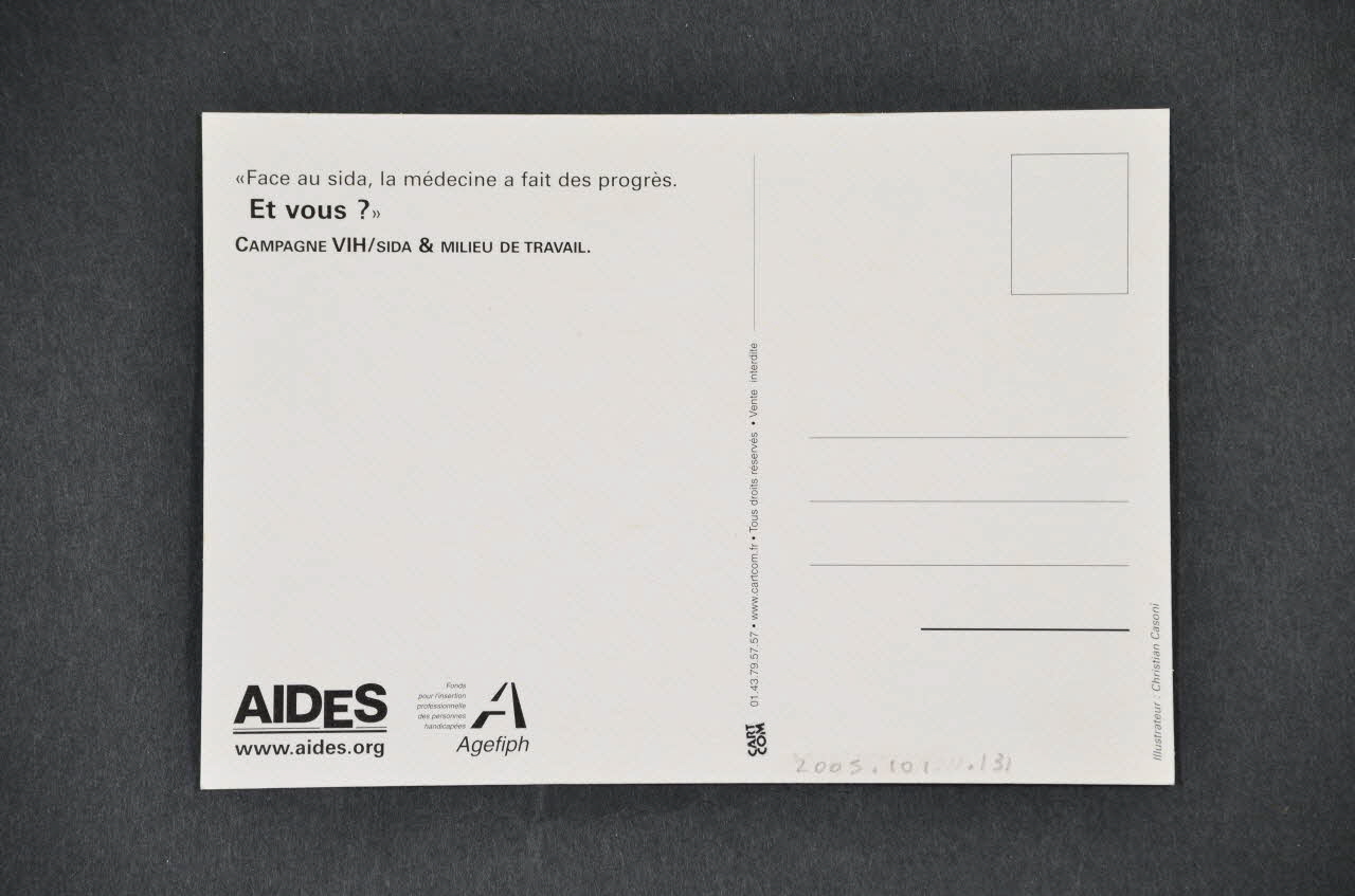 "LE VIRUS DU SIDA SE TRANSMETTANT // UNIQUEMENT PAR LE SANG, LE LAIT MATERNEL // ET LES SECRETIONS SEXUELLES, IL N'Y A // AUCUN RISQUE A BOIRE DANS // LA TASSE D'UN COLLEGUE". (Imprimé en capitales noires dans la partie supérieure), recto"Face au sida, la médecine a fait des progrès. // Et vous ?" // CAMPAGNE VIH/SIDA & MILIEU DE TRAVAIL. (Imprimé en noir sur blanc dans l'angle supérieur gauche), versoLogo