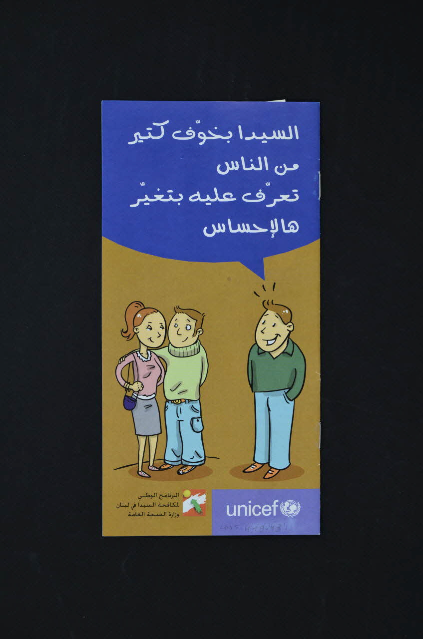 Brochure : jeune homme et couple de jeunes (en arabe) / Intérieur très illustré et coloré. - p.1 Fond blanc, impression en bleu et en brun (titres, traduire). Dessin légendé de 3 bonshommes marchant, l'air interrogatif puis accablé. - p.2 Fond bleu. Dialogue entre la jeune femme de la couverture et le donneur de conseils. Bulles (résumer) - p.3 Fond blanc, impression en bleu et en brun (titres et légendes traduire). Sur deux colonnes, dessins couleur légendés de 4 situations à risque (traduire les légendes) : rasoir et seringue, garçon et fille dans un lit, femme enceinte, transfusion - p.4 Fond blanc. En haut, le donneur de conseils ; bulle fond bleu, impression en blanc. En dessous, sur deux colonnes, dessins couleur légendés en bleu de 6 situations sans risque : apéritif avec un ami, serrage de mains, WC, piscine, coupure légère, éternuement - p.5 Fond blanc, impression en brun et bleu. En dessous, sur deux colonnes, dessins couleur légendés de 6 situations de protection : abstinence (?), fidélité (?), transfusion sécurisée (?), préservatif, ne pas accepter de partager seringue, seringue stérilisée - p.6 Fond violet, dessin couleur : le donneur de conseils et le couple. Bulle (résumer) - p.7 Fond blanc, impression en brun et noir, sous titres en blanc sur bandeaux bruns (traduire) - p.8 Fond violet. conversation entre l'homme et le donneurs de conseils. Bulles (traduire). Texte en bas en blanc sur bandeau brun (résumer) - p.9 Fond blanc. Impression en brun et en noir. En bas de page : dessin couleur un homme et le donneur de conseil buvant un verre ensemble. - p.10 Fond violet. Le donneur de conseils sert la main à un homme. Bulle (traduire)