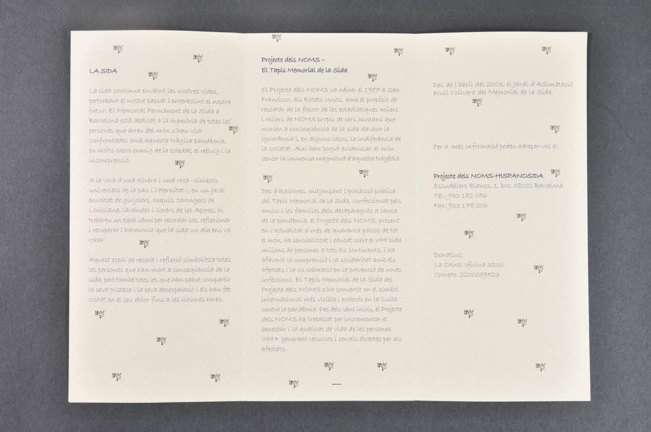 Feuillet 1. La Sida. Le mémorial permanent du sida à Barcelone est dédié à la mémoire de toutes les personnes qui sont confrontées à cette tragique pandémie et sont confrontées à la solitude au refus et à l'incompréhension. Le mémorial se situe dans une oliveraie, symbole universel de pais et d'éternité, dans un jardin, espace idoine pour se souvenir et récuper l'harmonie dérobée par le sida. espace symbolisant à la fois les personnes qui sont mortes du sida et celles qui les ont accompagnés et ont su partager avec elles tristesse et désespoir. Feuillet 2 Le projet international des Noms Feuillet 3 Depuis avril 2003 le Jardin d'Acclimatation accueille l'oliveraie du Mémorial du sida. Adresse de l'association et compte bancaire pour la donation. Feuillet 4 Texte du poème "Parlem de Tu" de Miquel Marti i Poi, dont les strophes marquent le monument du mémorial "J'ai parlé de toi J'ai parlé de toi, mais pas avec de la peine. / J'ai simplement parlé de toi, de ce que tu / disais, de la lente souffrance qui te minait / j'ai parlé de ces choses et aussi de tes goûts / de ce que tu aimais et de ce que tu n'aimais pas /de ce que tu faisais et de ce que tu sentais. / J'ai parlé de toi, mais pas avec de la peine. / Et peu à peu, tu deviendras tant nôtre / qu'il ne sera plus necéssaire de parler de toi / pour se souvenir de toi, et peu à peu, tu seras / un geste, un mot, un goût, un regard / qui surgira sans qu'on le dise ou qu'on le pense. Miquel Marti i Poi. Llibre d'absencies."