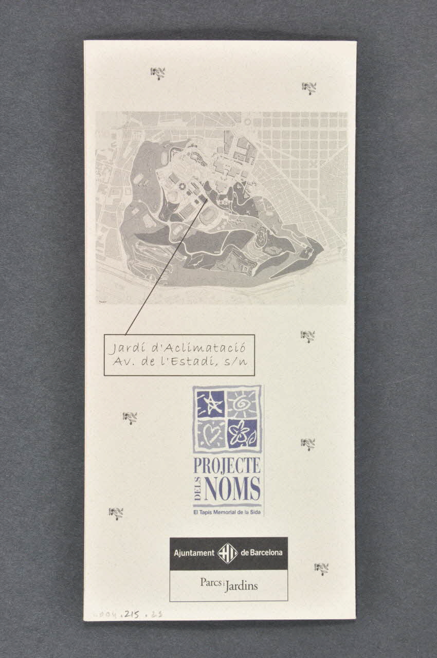 - PROJECTE // DELS NOMS // El Tapis Memorial de la Sida // - Ajuntament de Barcelona // Parcs i Jardins (deux logos en bas au dos du dépliant), versoSous-titre