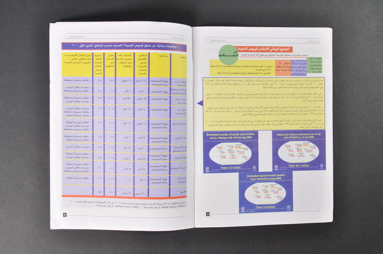 Au recto, le fond est blanc. En haut, en caractères arabes, en rouge, se trouve le titre de la revue. A droite, lfigure un logo du Programme National de Lutte contre le Sida au Liban. A l'intérieur, le fond est blanc, iles textes sont sur une ou deux colonnes en noir. Il y a plusieurs bandeaux ou encarts colorés par page : jaune, bleu, violet, vert, rouge, rose. On trouve de nombreuses photos en couleur de réunions de l'association.Inscriptions